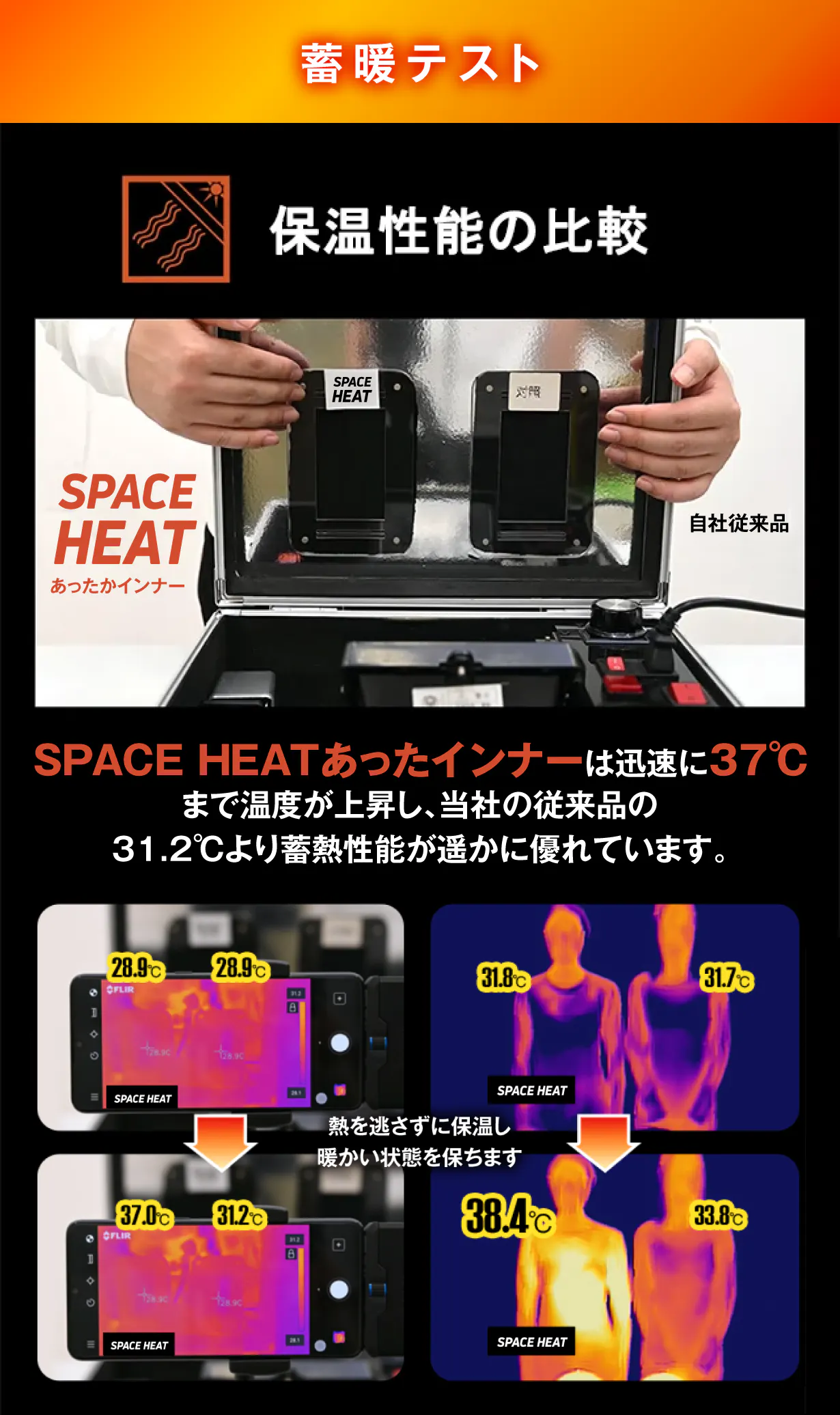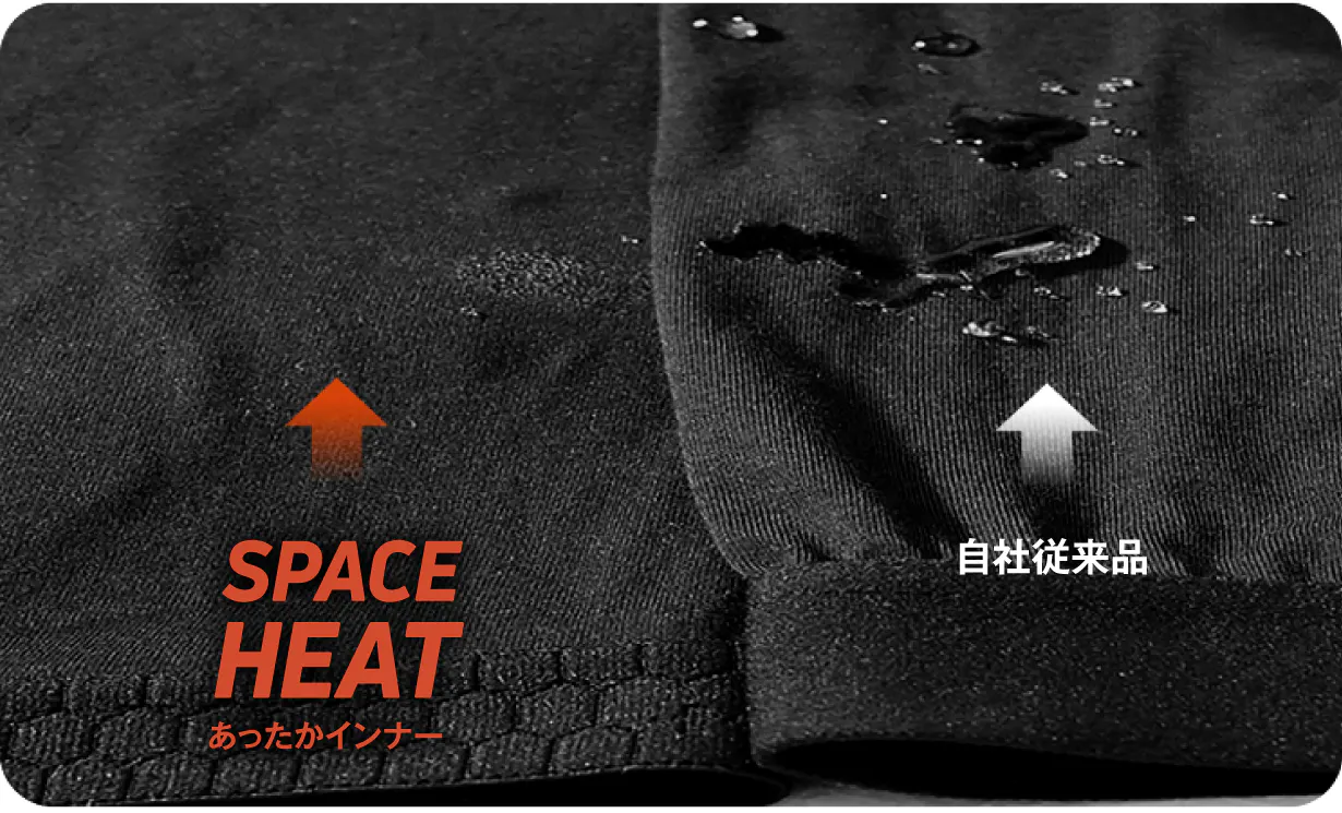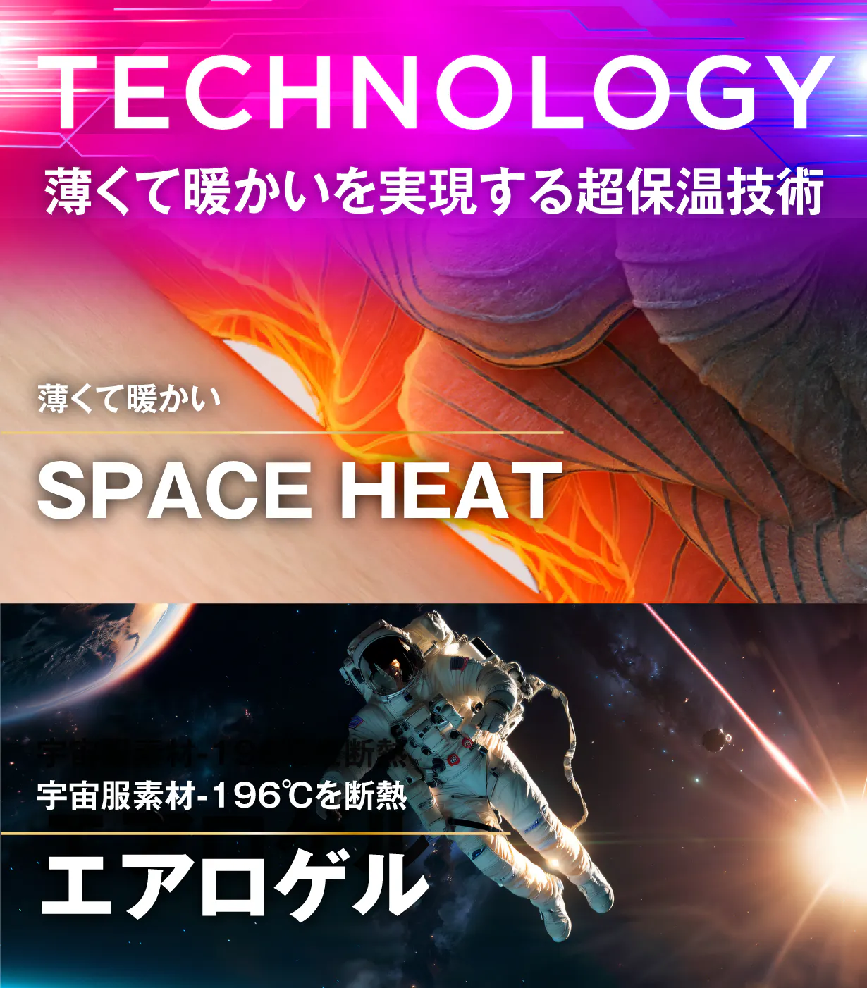 SPACE HEAT技術は、遠赤外線加熱技術を用いて、人体から放出される遠赤外線を吸収し、そのエネルギーを利用して高い保温効果を実現しています。