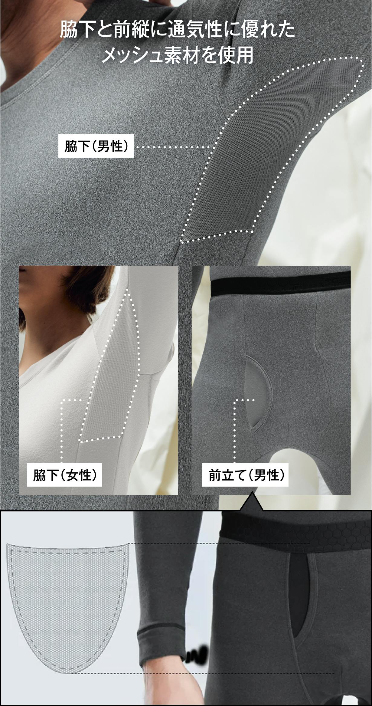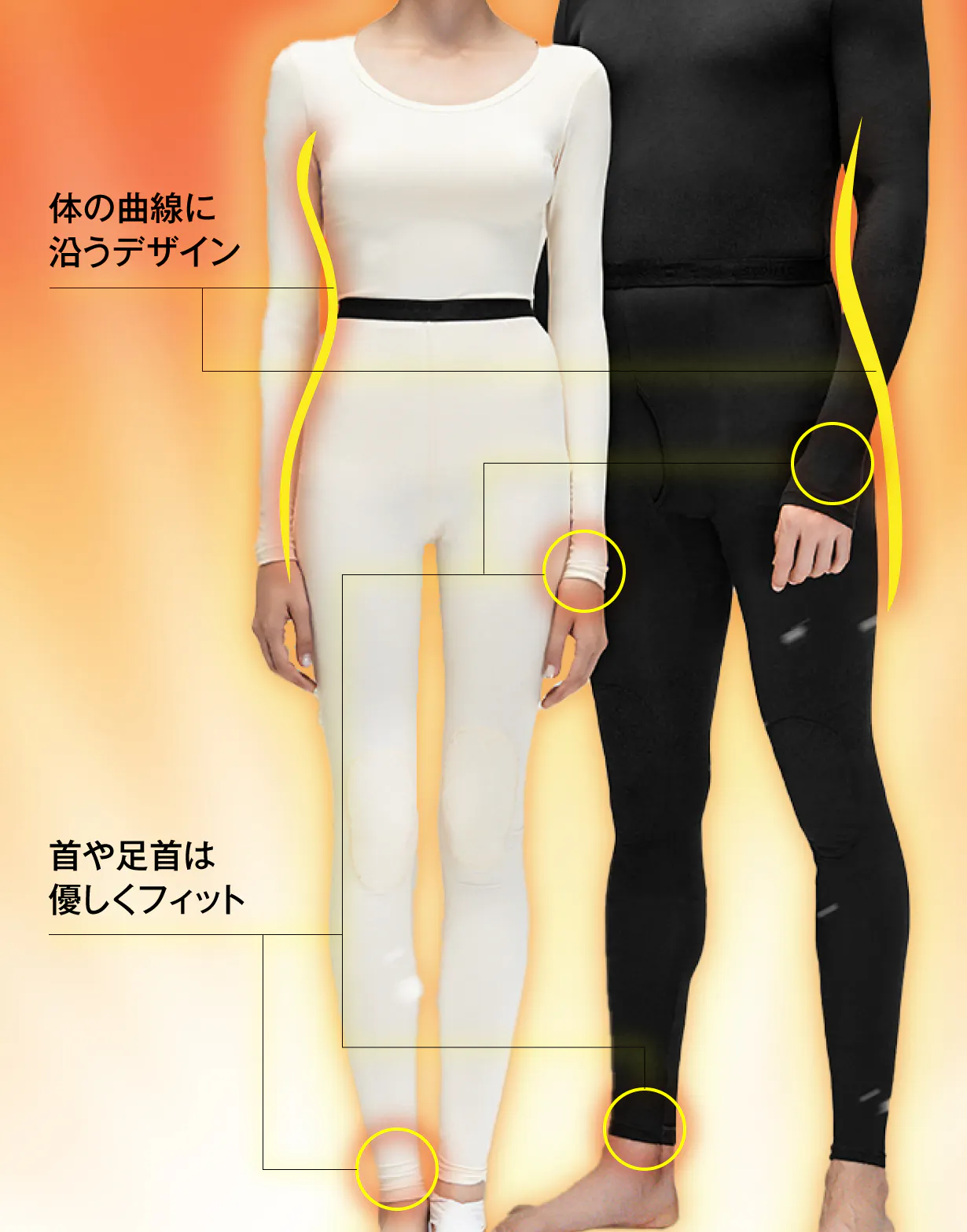 もっと快適に暖かく!熱を逃さないように細部までこだわってデザインしています。体の曲線に沿うデザインで、手首や足首は優しくフィットする袖口となっています。
