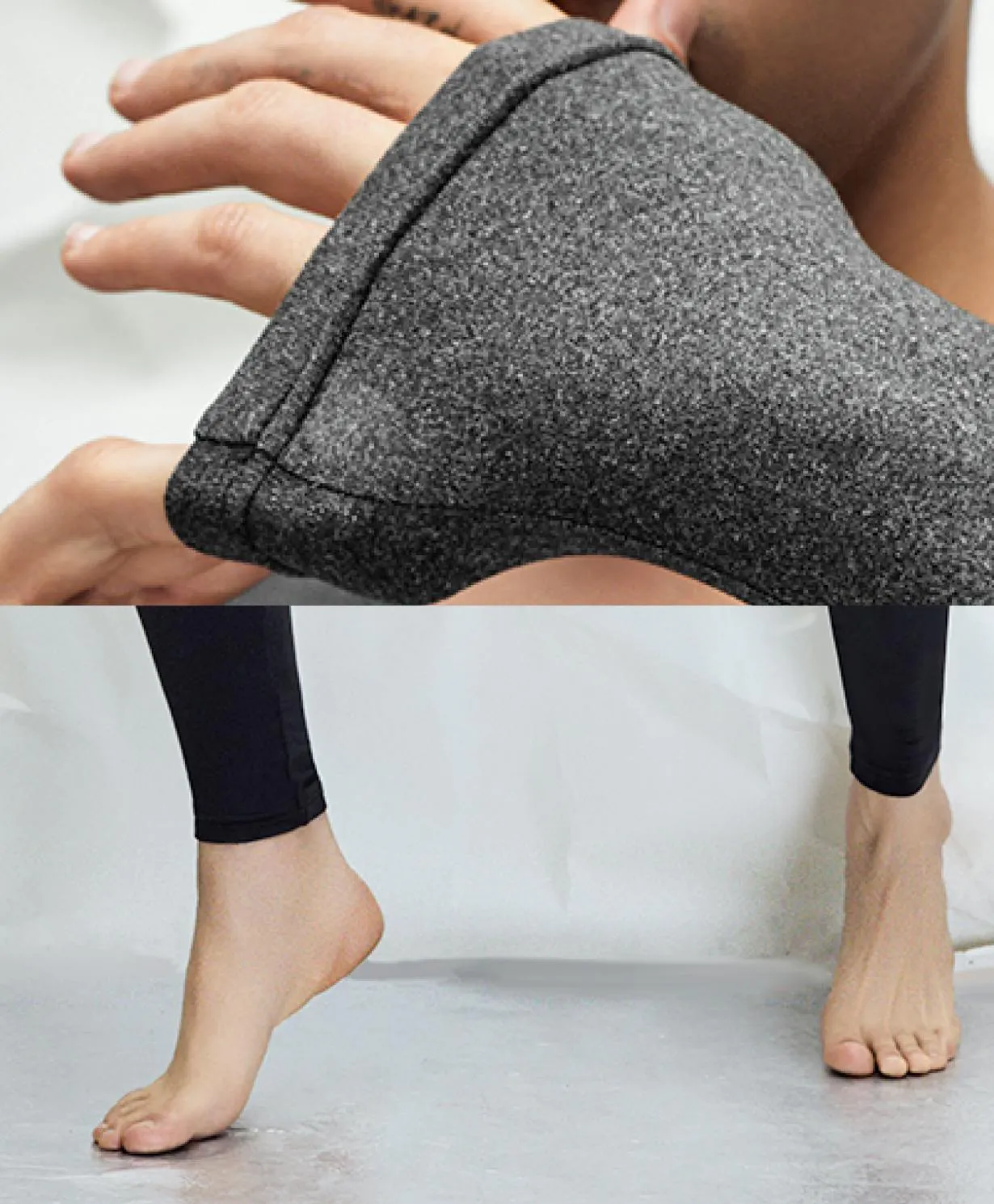 今回の製品では、保温を重視したい膝部分はエアロゲルを使った3層構造パッド仕様となっております。表層には触り心地がふわふわの温熱生地をたっぷりと、中層にエアロゲル素材を使用。そして肌に触れる部分には、温度を吸収蓄熱するSPACE HEAT素材が入っており、着心地を損なうことなく暖かさが持続します
