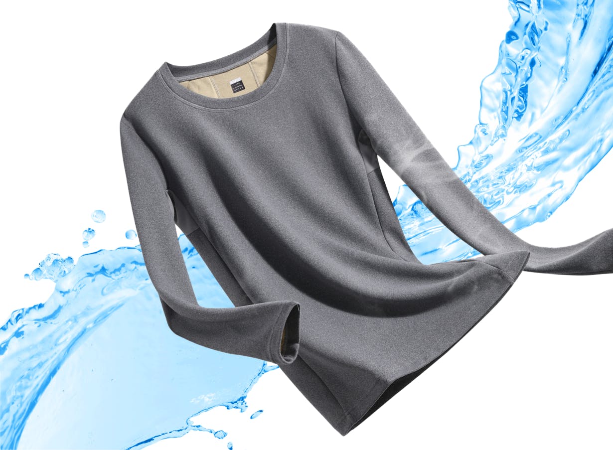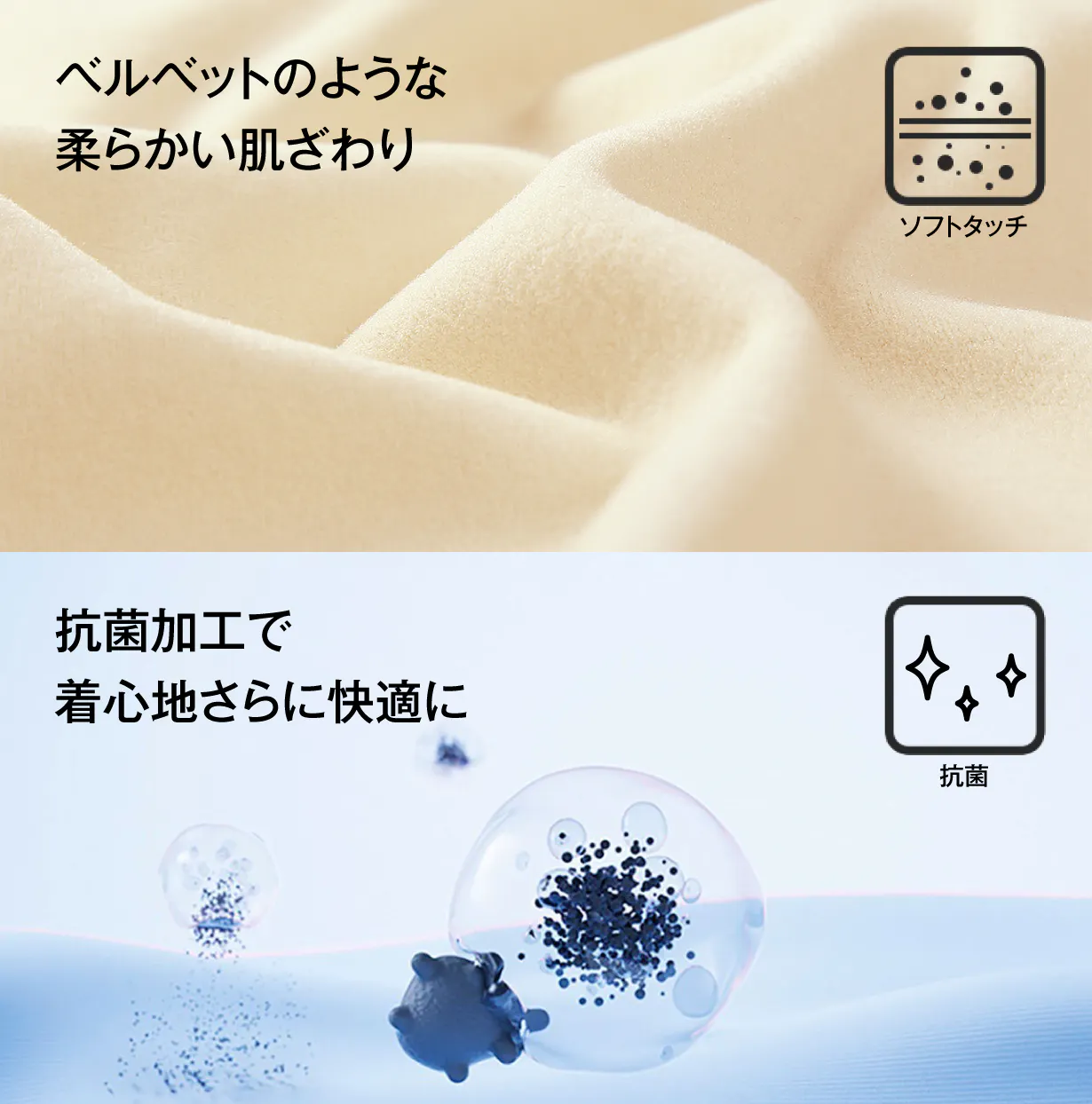 SPACE HEATの生地はマイクロファイバーで織られているため、ふわふわとした柔らかく優しい着心地の生地です。さらに遠赤外線イオンの損失を効果的にブロックしながら、体から排出された汗などの水分を外へ効率的に放出します。これにより、暖かく高い保温性と抜群の着心地が実現しました。