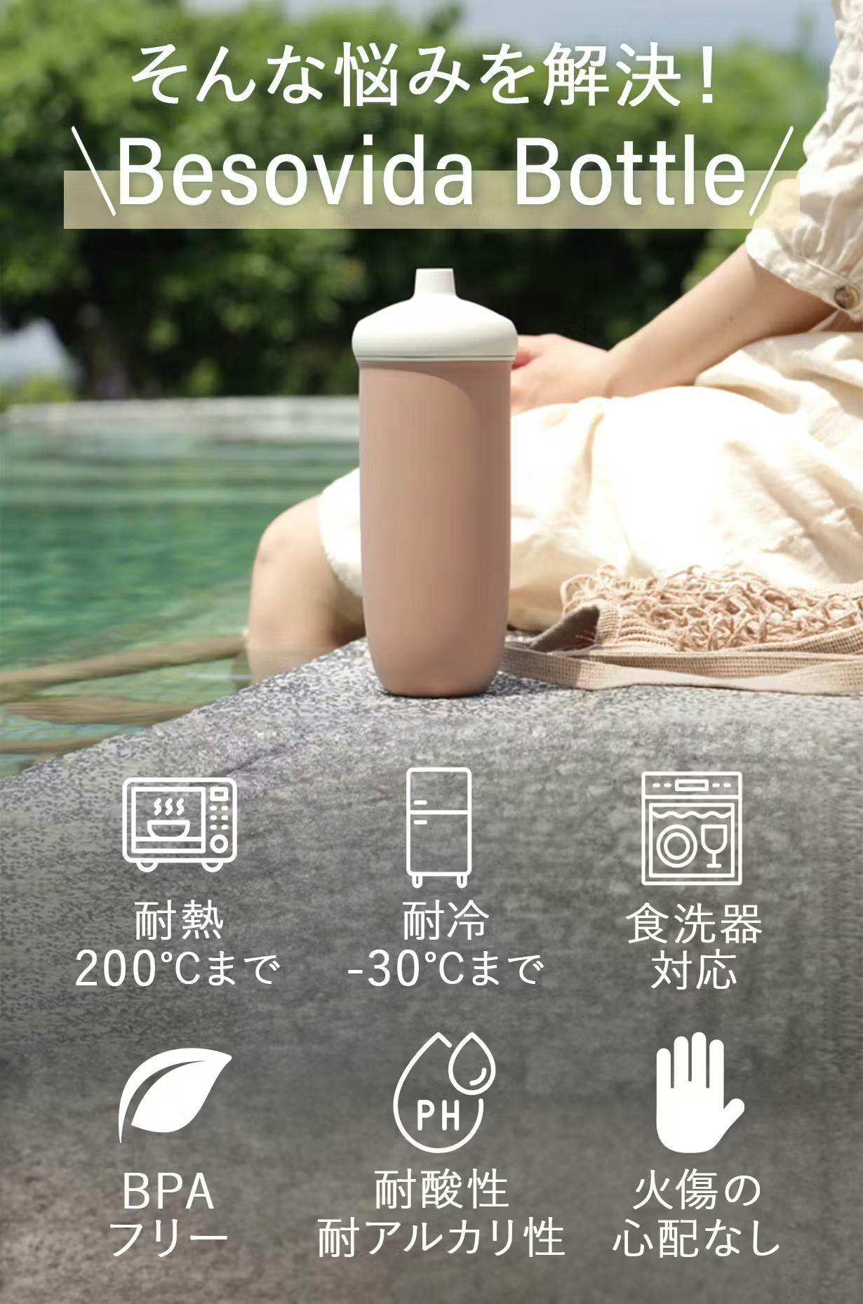 ・Besovida Bottle:これらの中間的な位置にあり、軽量でありながら耐久性があり、耐衝撃性も兼ね備えています。さらに、熱にも冷気にも対応できるため、ホットドリンクや冷たい飲み物にも使えます。