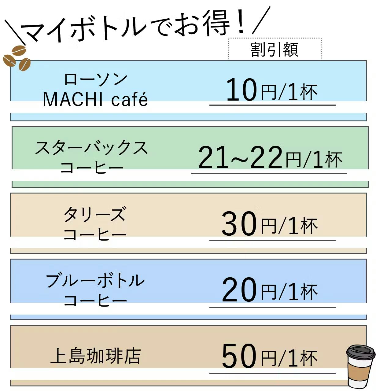 Besovida Bottleのもう一つの大きなメリットは、カフェで使用することで割引を受けられる点です。以下のカフェでマイボトルを持参すると、このような割引が受けられます。