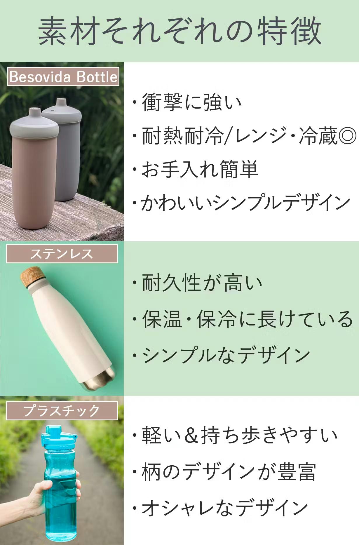 ボトルを選ぶ際に重要なのは、その素材です。ここでは、ベソビダボトルをステンレス製やプラスチック製のボトルと比較してみましょう。