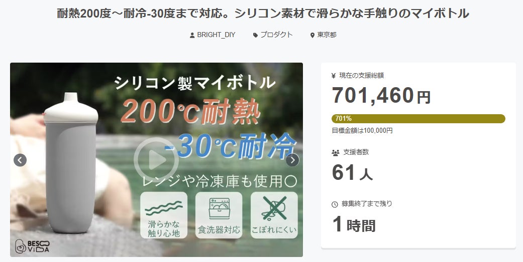 ご支援者 、「耐熱200度〜耐冷-30度まで対応。シリコン素材で滑らかな手触りのマイボトル」にご興味をお持ちいただきありがとうございます。お陰様で、開始から支援総額70万円達成することができました!終了までわずか1時間となります。<-30℃から200℃まで対応可能な耐熱・耐冷シリコンボトル!電子レンジ、冷蔵庫、冷凍庫での使用もOK! 倒れても漏れにくい設計で、パソコンの近くでも安心して置けます。 BPAフリー素材で安心・安全、柔らかな触り心地も抜群!シンプルでおしゃれなデザインが魅力のボトルです。>プロジェクト終了後、「耐熱200度〜耐冷-30度まで対応。シリコン素材で滑らかな手触りのマイボトル」をMachiya特別価格で入手することはできなくなりますので、ご支援がまだの方、追加支援をご検討の方はお急ぎくださいますようお願い申し上げます。ご興味のある方、ぜひ支援お願い致します。https://camp-fire.jp/projects/808171/viewBrightチームは、当プロジェクトをもっと多くの方に知っていただきたいと考えております。よかったら、FacebookやTwitter等のSNSでのシェア・拡散をお願い致します。#brightdiyどうぞよろしくお願い致します。Brightチーム