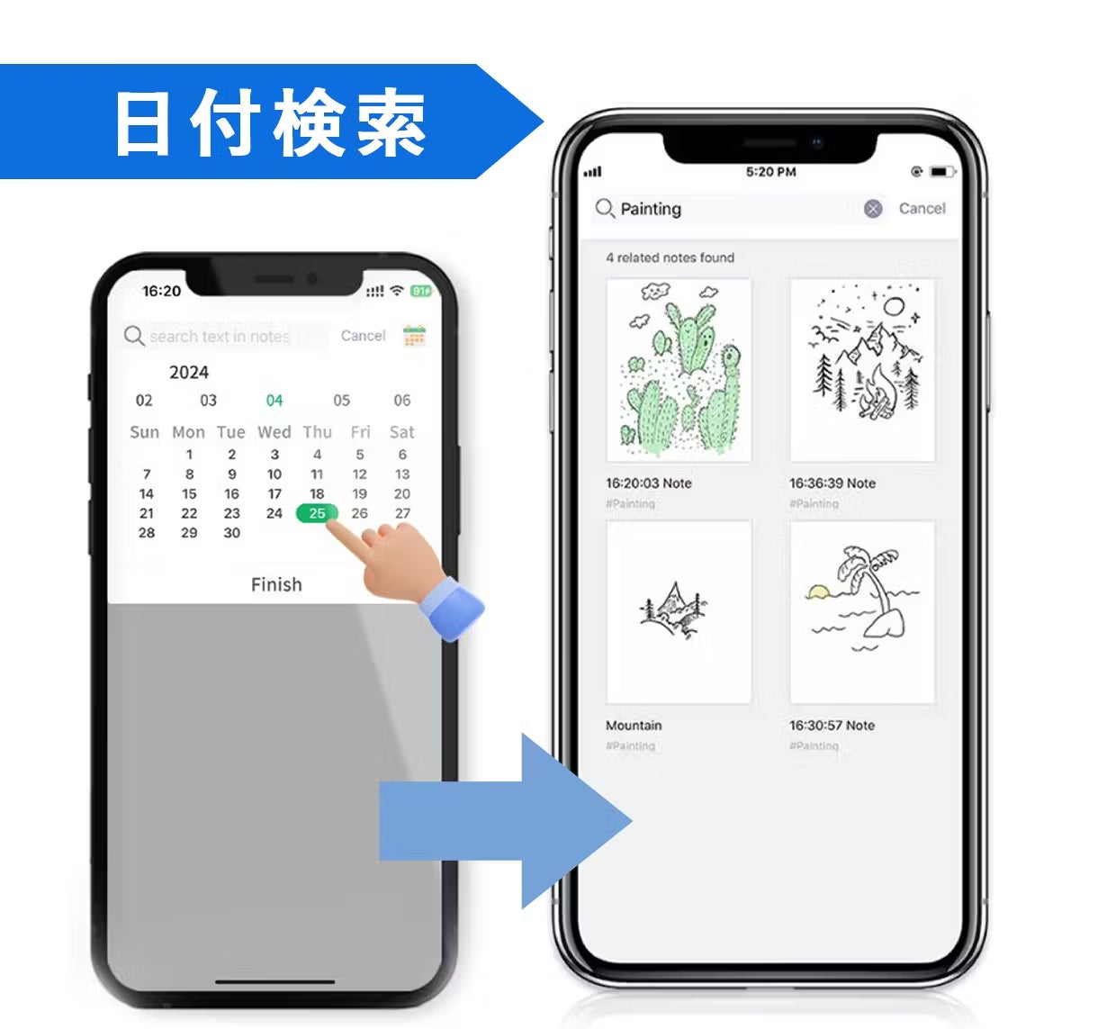 スケジュールを設定した日付を基に、特定の日に書いたメモを簡単に検索できます。会議やイベントの内容を日付ごとに整理しておけば、後で必要な情報をすぐに見つけることができます。