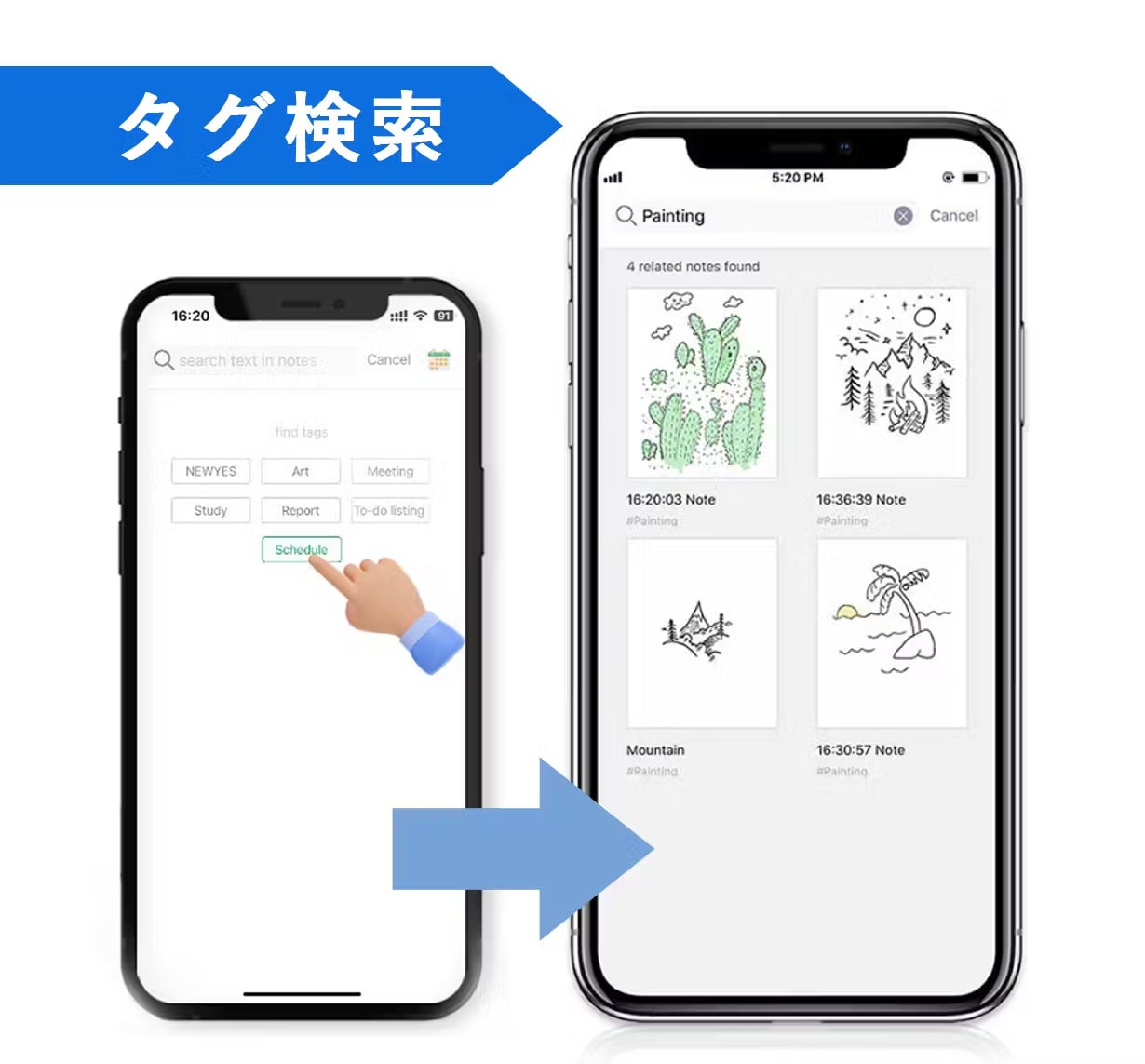 ノートに設定したタグを使って、関連するメモを簡単に探し出すことができます。例えば、「会議」「アイデア」「重要」など、自由にタグを設定しておけば、関連するメモを瞬時に検索できます。タグで整理することで、大量のメモの中から必要な情報をすぐに取り出せます。