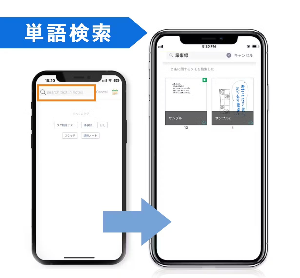 電子テキストに変換された手書きメモの中から、特定の単語を検索することができます。これにより、詳細な内容まで正確に検索できるため、必要な情報を簡単に見つけ出すことができます。特に情報量が多いノートでも、簡単に目的の部分にアクセスできます。