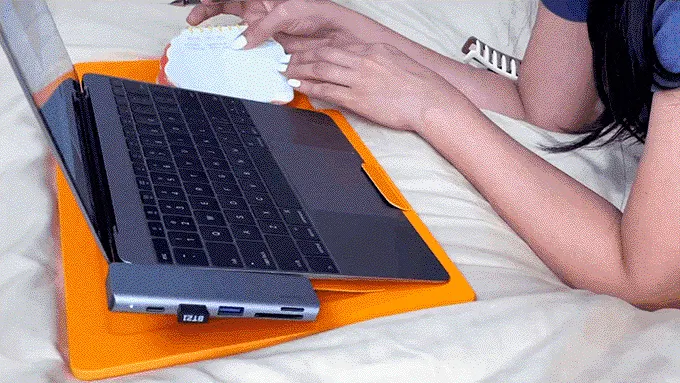 『PUNCUBE』を使用することで滑りにくくなり、膝上でも安定してノートPCが使用できるようになります。