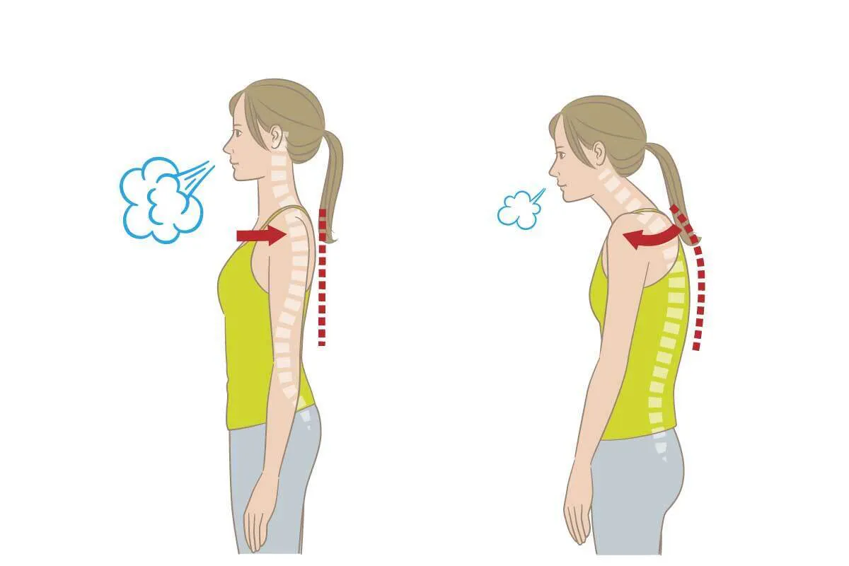 猫背になると横隔膜が圧迫されて、無意識に呼吸が浅くなり、酸素摂取量が減少します。細胞の酸素量が低下すると、新陳代謝や疲労回復などが遅れます。