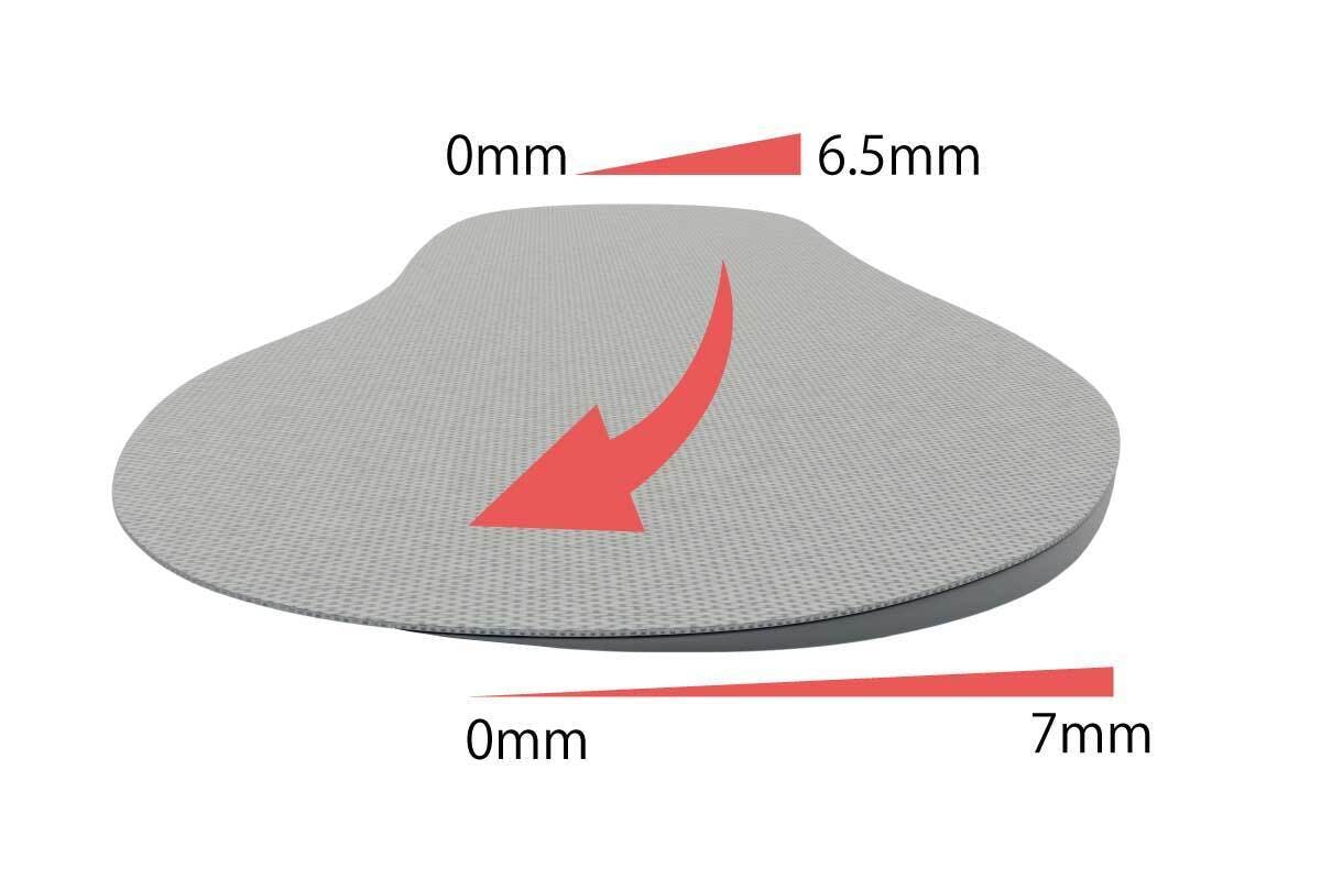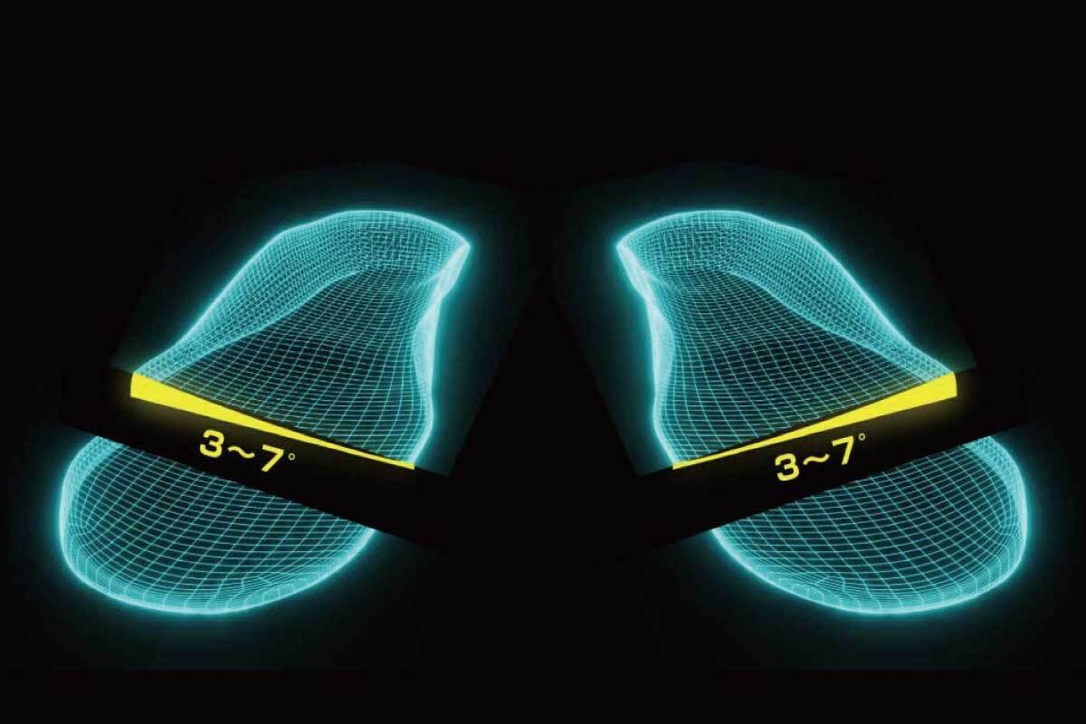 傾斜角度を維持したまま、極限まで薄くしました。圧迫により甲を痛めためる、指が窮屈になることが少なくなります。