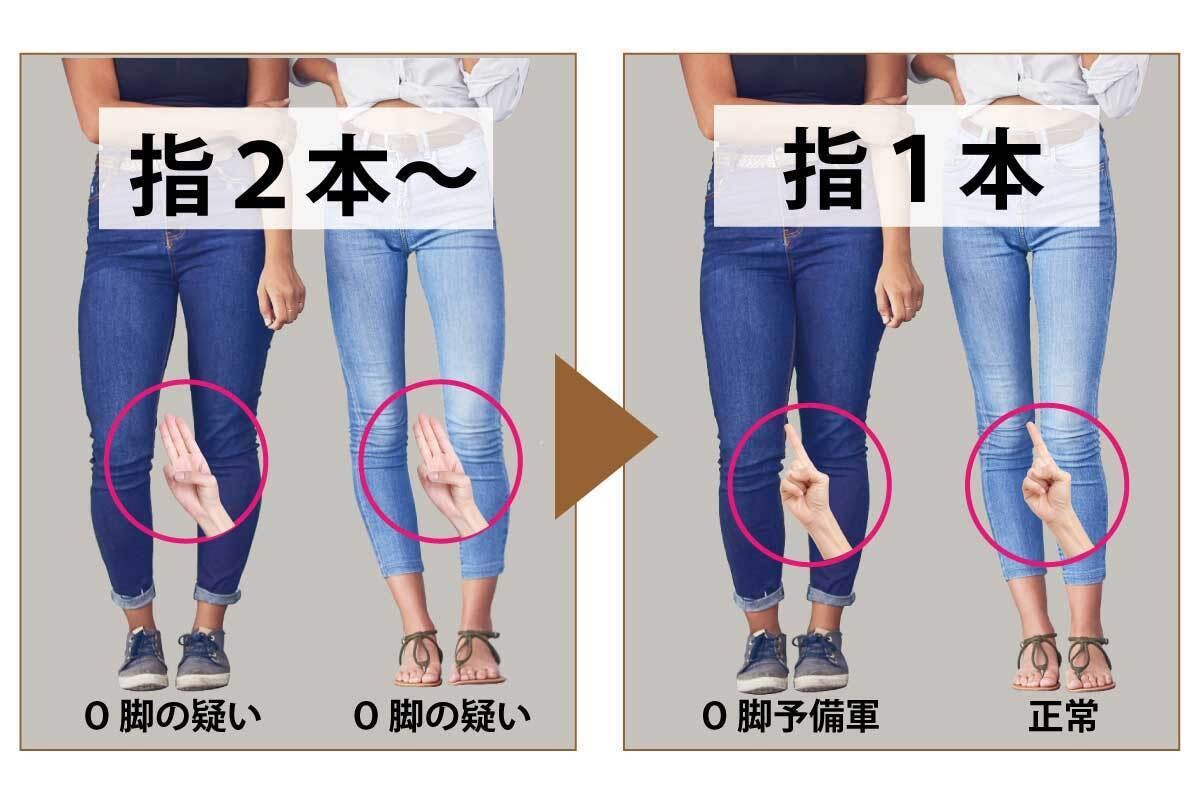 脚を揃えて、ヒザの隙間に2cm未満(指1本)が正常です。指2本以上(3cm~)でO脚とされます。その中間は予備軍です。数年ほどで指2本の恐れがあります。