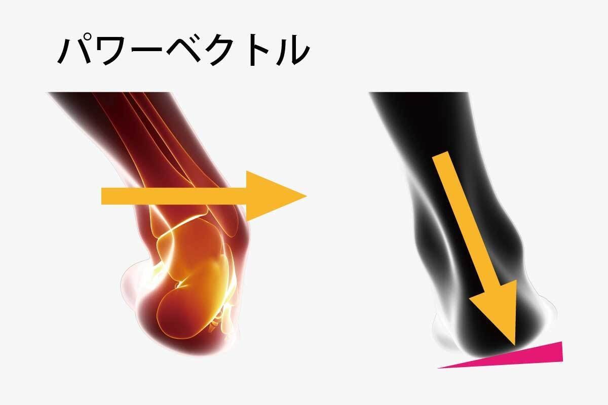 O脚用のジクソール- フラットよりも、衝撃吸収性を高めるために硬くしています。また指の付け根付近の傾斜を高めることで、切り返しや足裏の安定性を図っています。
