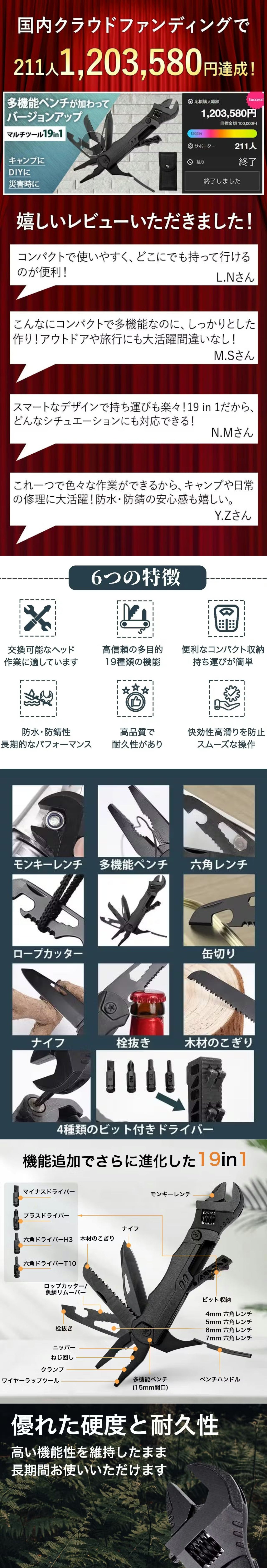 新たに多機能ペンチが加わってバージョンアップ!アウトドア、キャンプなどのレジャーだけでなく、災害時や日常DIYでも大活躍なツールを集めたコンパクトな多機能マルチツールレンチ【マルチツール 19D】です!