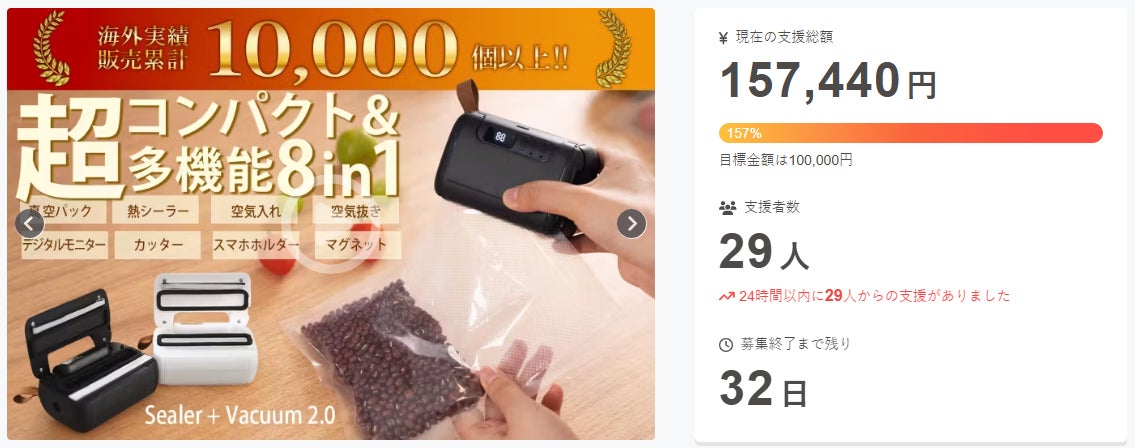 この度は「累計出荷数1万個◎真空パックできて液体保存も可能!超コンパクトな8in1シーラー」に支援頂き誠にありがとうございます!お陰様で、開始から3時間経たずに10万円の目標金額を100%達成することができました。ご興味のある方、ぜひ支援お願い致します。https://camp-fire.jp/projects/801298/viewBrightチームは、当プロジェクトをもっと多くの方に知っていただきたいと考えております。よかったら、FacebookやTwitter等のSNSでのシェア・拡散をお願い致します。#brightdiyどうぞよろしくお願い致します。Brightチーム