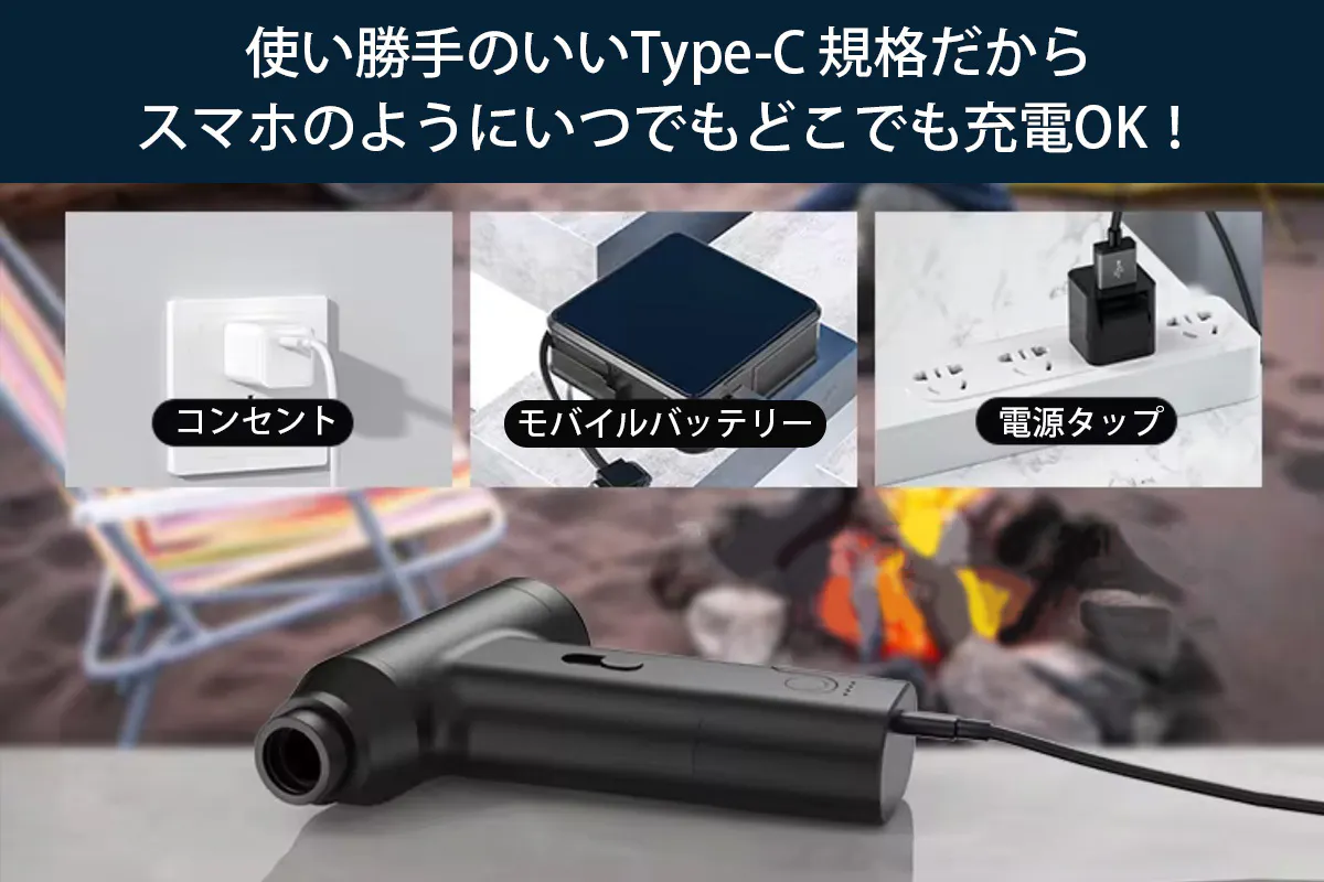 本体底面にある Type-C USBポートから場所を選ばずに充電できます。