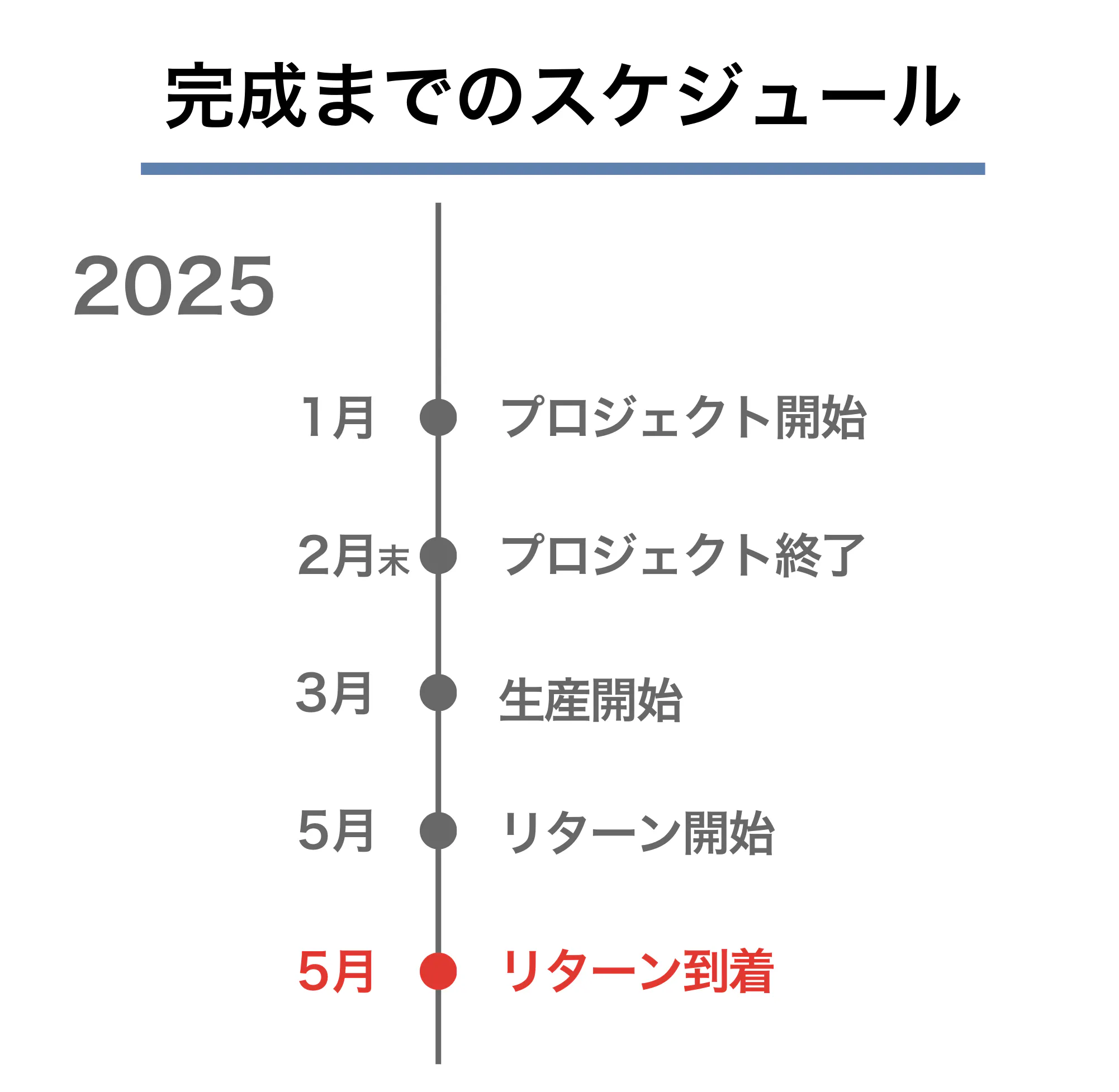 ※本文中に記載させていただいたスケジュールは、あくまでプロジェクト公開時点の予定です。クラウドファンディングを経て輸入を行う性質上、配送遅延のおそれがございます。