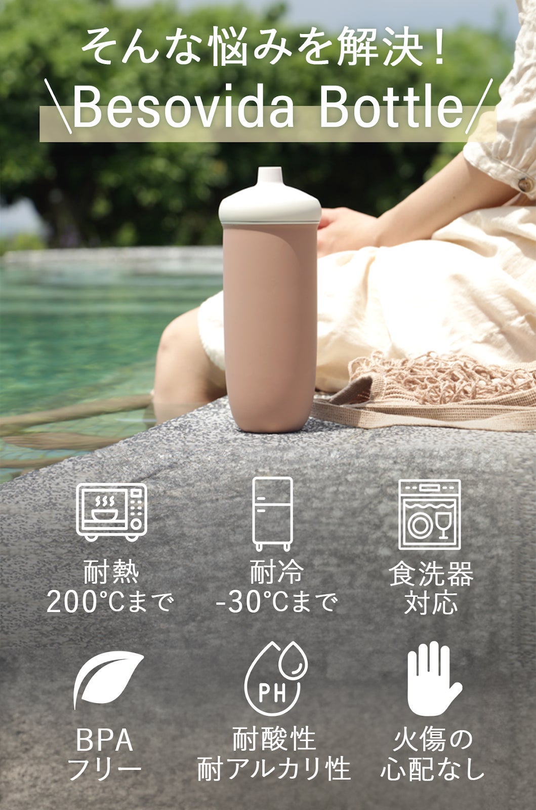 耐熱200度〜耐冷-30度まで対応。シリコン素材で滑らかな手触りのマイボトル