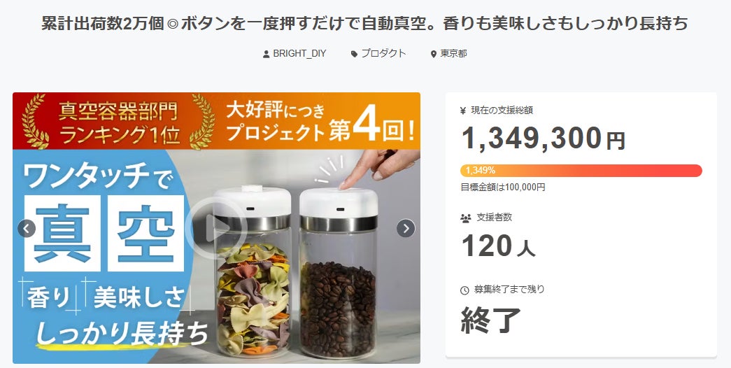 この度は「累計出荷数2万個◎ボタンを一度押すだけで自動真空。香りも美味しさもしっかり長持ち」に支援頂き誠にありがとうございます!お陰様で、開始から10万円の目標金額を1300%達成することができました。ご興味のある方、ぜひ支援お願い致します。https://camp-fire.jp/projects/808193/viewBrightチームは、当プロジェクトをもっと多くの方に知っていただきたいと考えております。よかったら、FacebookやTwitter等のSNSでのシェア・拡散をお願い致します。#brightdiyどうぞよろしくお願い致します。Brightチーム