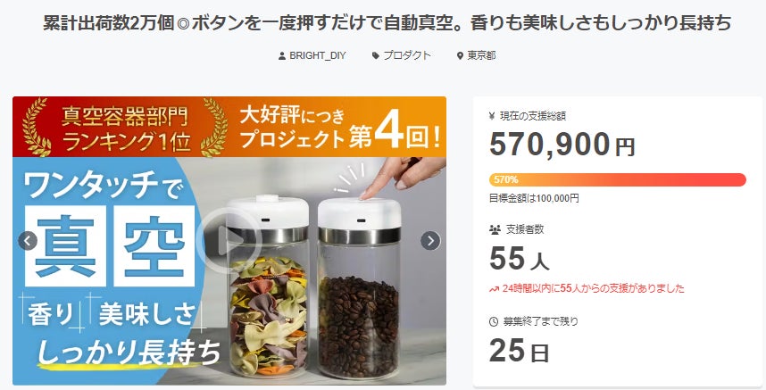 皆さんこんにちは、Brightチームです。この度は「累計出荷数2万個◎ボタンを一度押すだけで自動真空。香りも美味しさもしっかり長持ち」を支援いただき、本当にありがとうございます。おかげさまで開始から数分で目標を達成することが出来ました。また本日のCampFireランキングプロダクト部門で 1 位!総合で 3 位に入賞することが出来ました!皆さまの支援を励みに、喜んでいただける製品作りに努めてまいります。2月中旬まで販売期間は続きますので、ぜひSNSでのシェアや身近な方にもおすすめしていただけると嬉しく思います。https://camp-fire.jp/projects/808193/viewどうぞよろしくお願いいたします。ありがとうございました。スタッフ一同