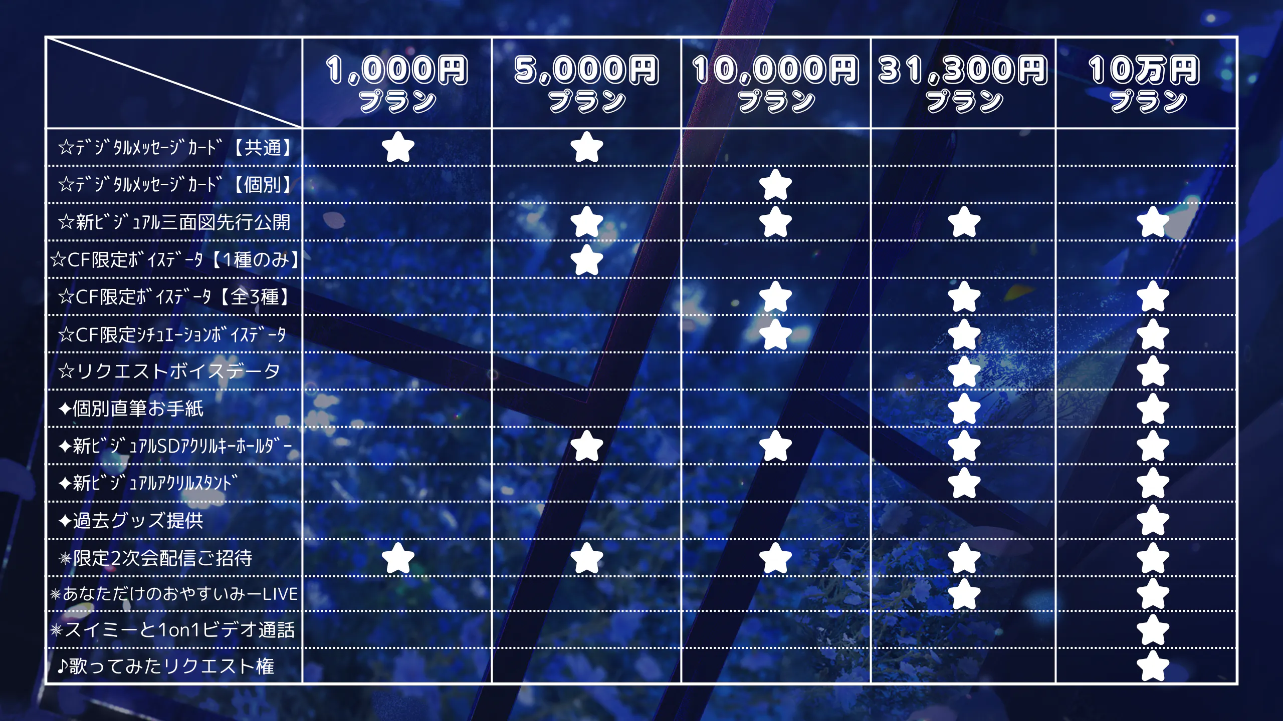 追加プランを除く5,000円〜10万円プランに含まれる『CF限定ボイスデータ (おはよう・おやすみ・励まし)』、『リクエストボイスデータ』を動画付きにアップグレード!