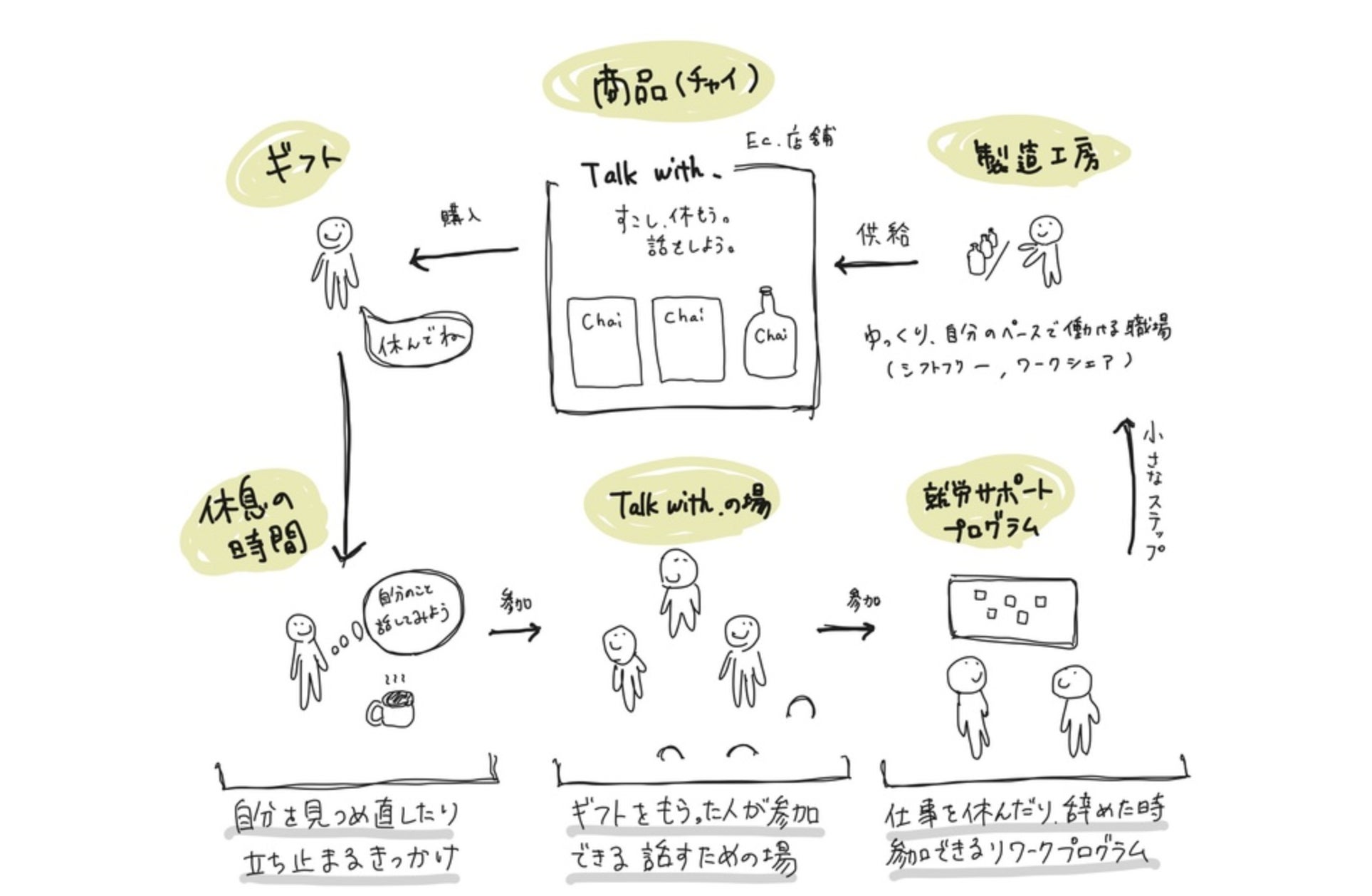 24時間いつでも出勤OK、時間給ではなく「納品制」を採用し、時間に縛られない働き方を実現。また、チャイの調合ワークショップでは、講師がアバター(分身キャラ)を使って接客する試みで、自分の姿を見られることに抵抗があるなど、 さまざまな事情を抱えた人でも活躍できるように工夫されています。