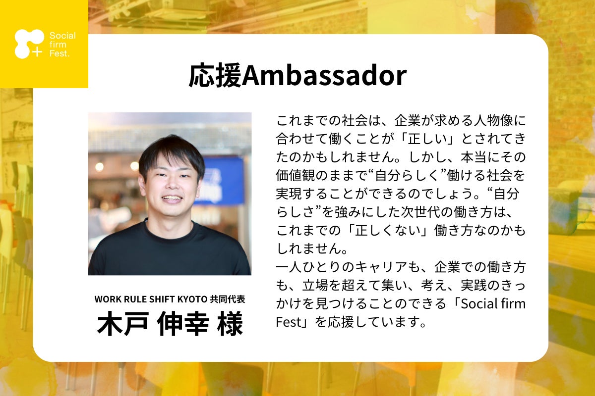 一人ひとりのキャリアも、企業での働き方も、立場を超えて集い、考え、実践のきっかけを見つけることのできる「Social firm Fest」を応援しています。