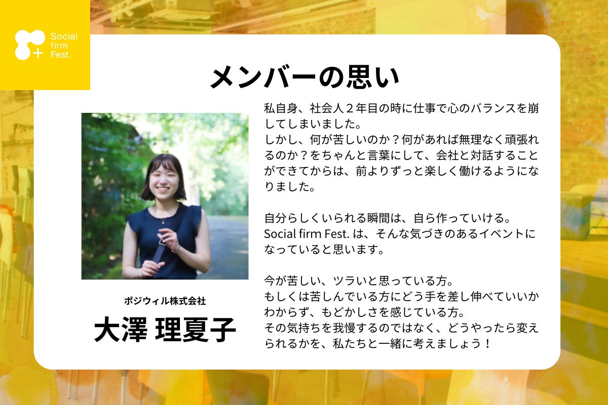 今回はそんなSocial firm Fest.メンバーであるポジウィル株式会社の大澤 理夏子の思いを紹介します。