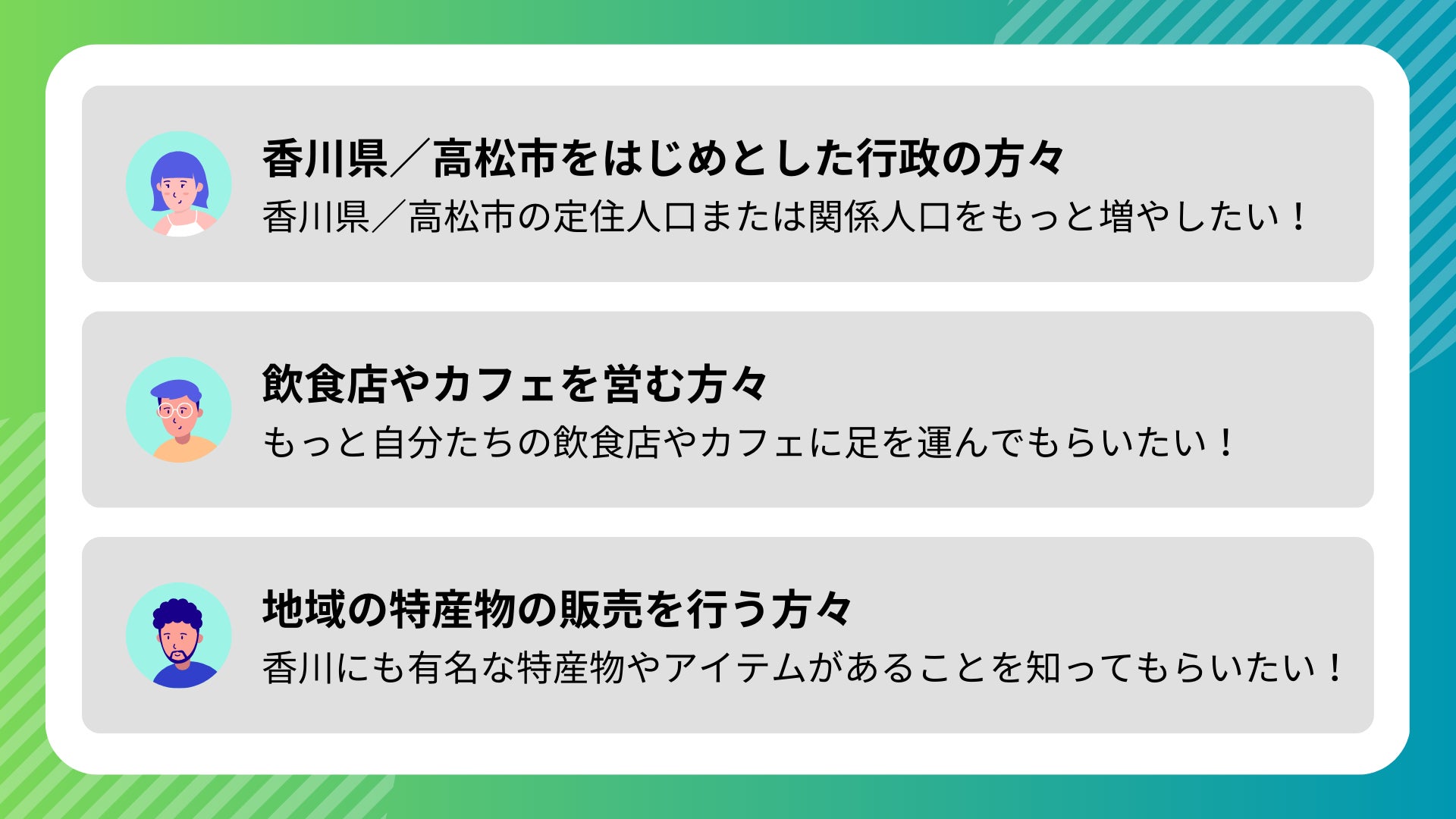 三人とお話すると、愛する香川に「影響を与えたい」と覚悟を持って語っていたことが印象的です。このプロジェクトが香川の産業に貢献しながら香川のファンを増やし、実体のある「関係人口」を生んでいくことを願っています。