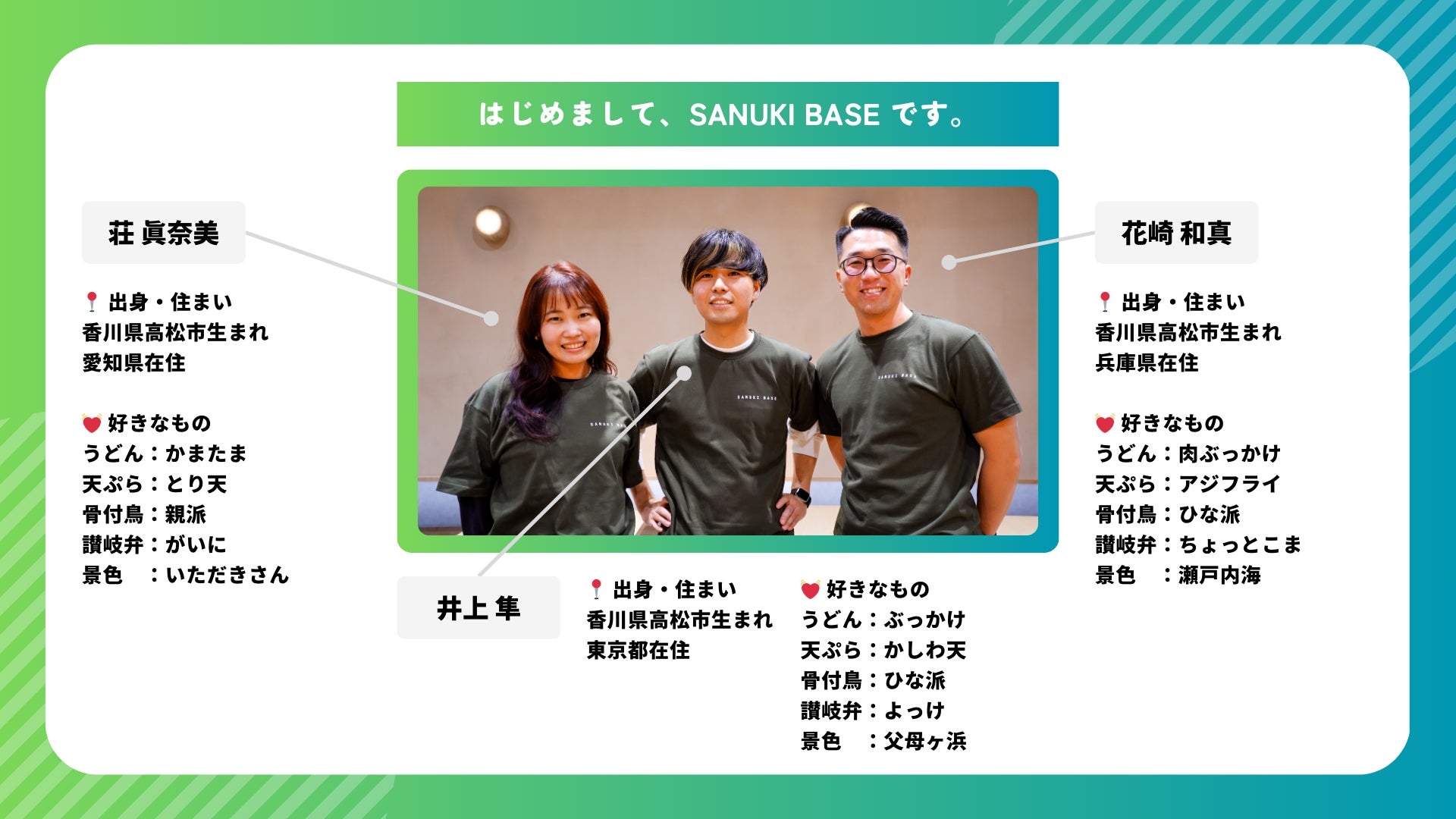 はじめまして。香川県出身、1994年生まれの3人トリオで活動しているSANUKI BASE(サヌキベース)と申します。