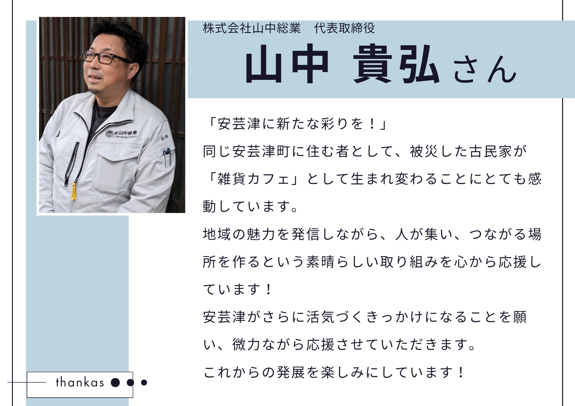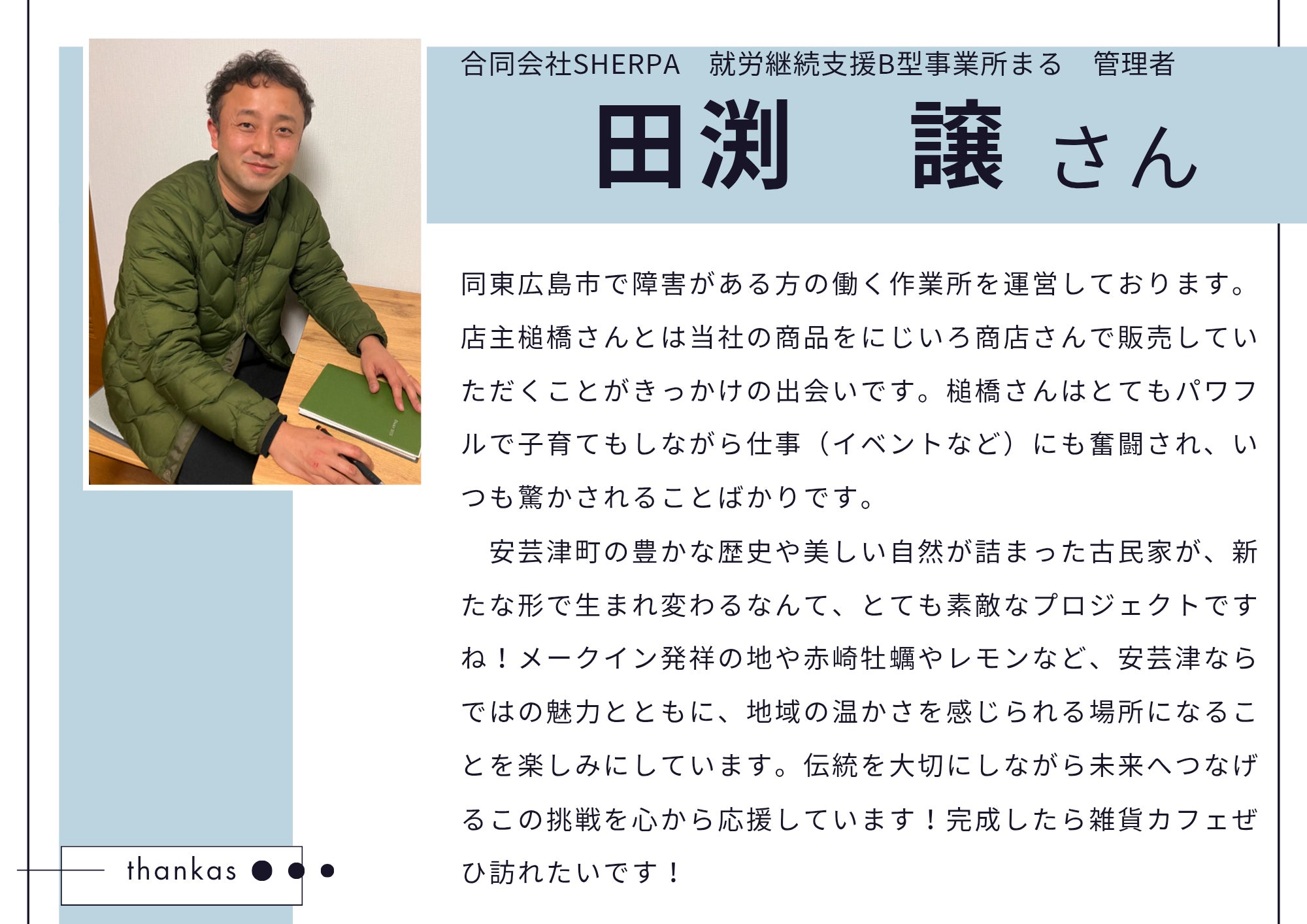 今回古民家雑貨カフェにすることで、安芸津によるきっかけづくりになったり、作家さん同士の交流の場所や、子供連れで気軽に寄れる場所を提供していきます。