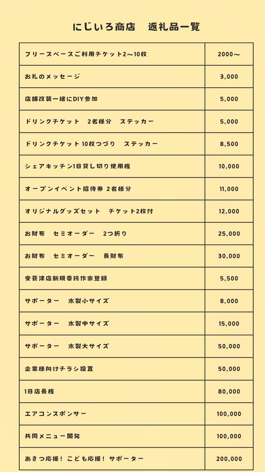 また、リニューアル後の店舗で使えるドリンクチケットや作家様のハンドメイド品、シェアキッチンや1日店長券に加え、オリジナルグッズセットなどたくさんの返礼品をご用意しております。