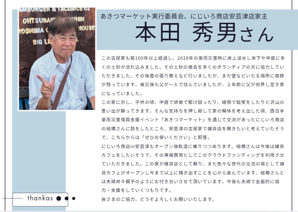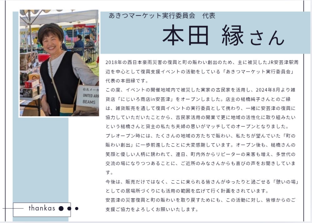 本田さんは、西日本豪雨災害復興イベントととして開催された【あきつマーケット】の主催をされている方です。