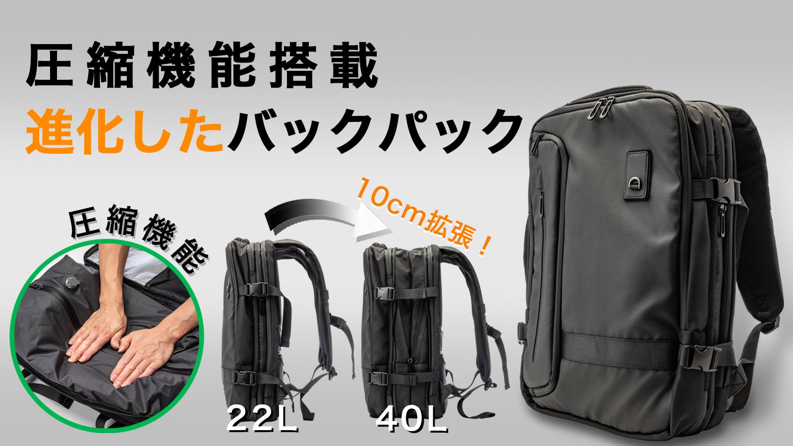 圧縮機能のあるバックパックは、旅行や出張にめちゃくちゃ便利。荷物が1/2に圧縮されて、機内持ち込みサイズにもぴったり収まります。