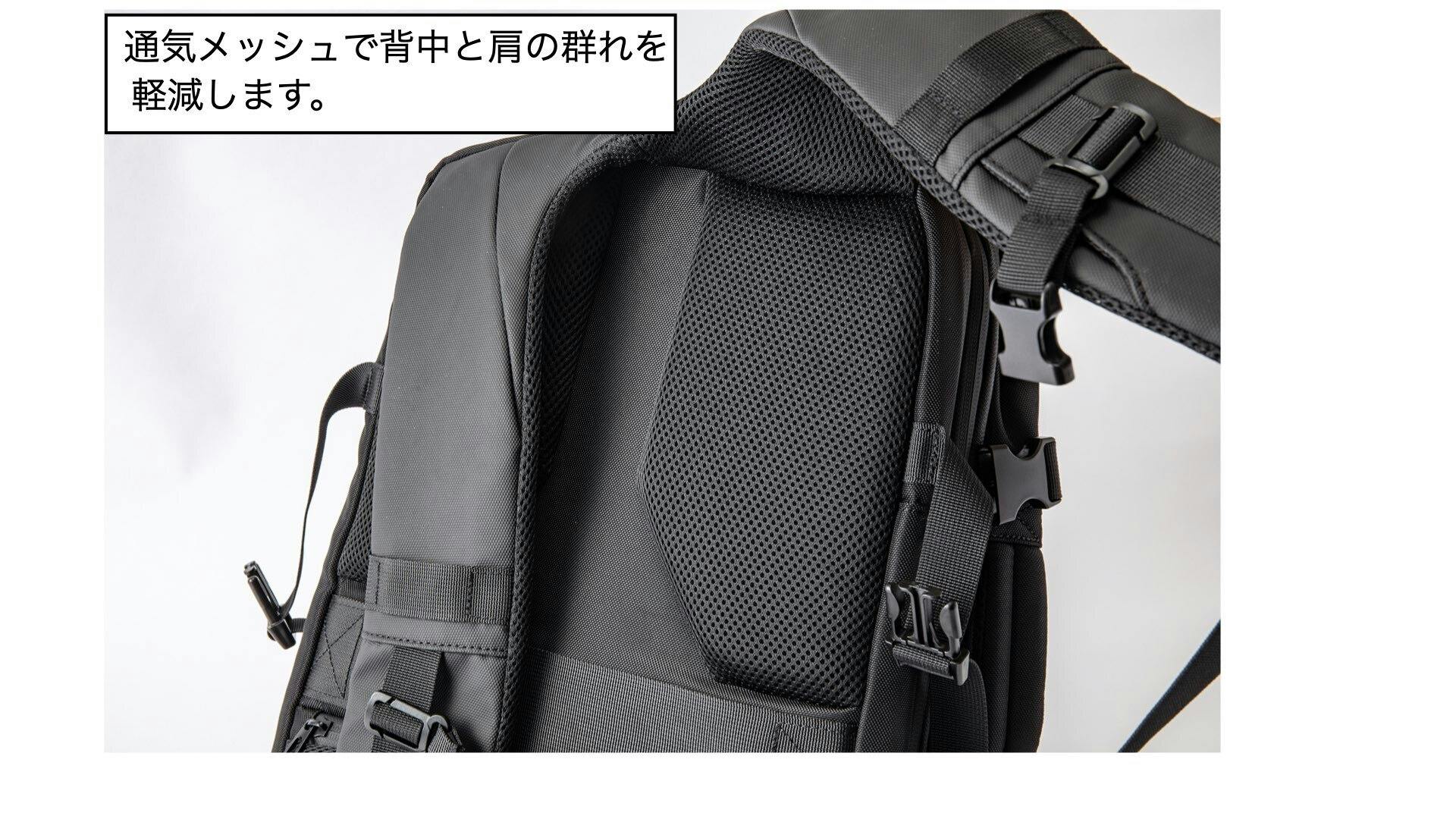 ポイント3 チェストベルトで肩の負担を軽減、 背中には通気メッシュ蒸れにくい