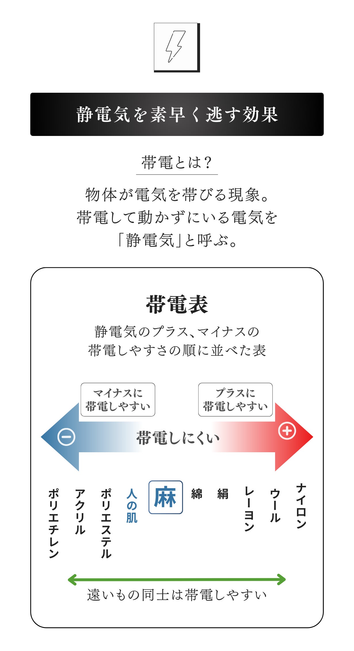 ヘンプ繊維の中心には「ストロー状の空洞」と「繊維表面に刻まれた無数のヒビ割れや小さな空洞」があり、肌の湿気や汗を吸い上げ、熱とともに空気中に発散。