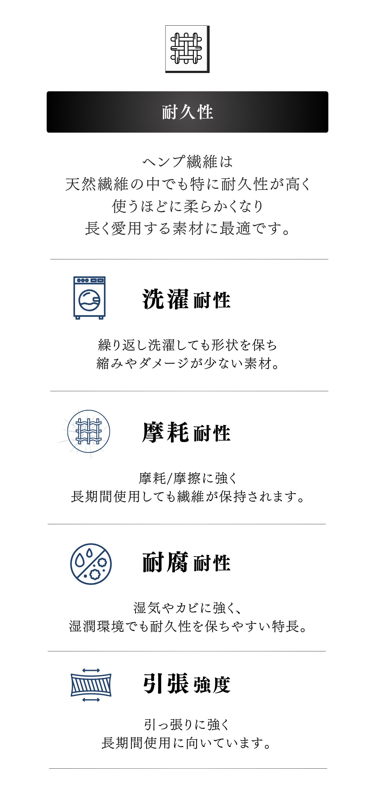 ヘンプの紫外線カット率は「ヘンプ:95%以上」「シルク:84%」「コットン:68%」「麻(リネン):56%」と、もっとも優位性を持つ繊維。またNGO団体Hemp Foundationによると、ヘンプ繊維は99.9%ものUVカット効果があり、コットンより50%以上も優れているという結果。(*2)*1:一般財団法人ボーケン品質評価機構データ*2:SDGsメディア『Spaceship Earth(スペースシップ・アース)