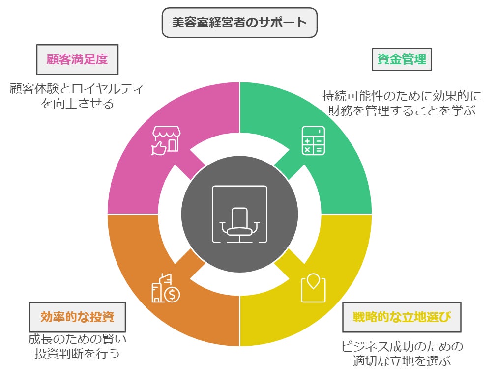 また、長く経営を続けるためには、初期の段階から戦略的な資金計画や設備投資が欠かせません。こうした知識を学ぶことで、経営者の皆さまが独立しても着実に経営を続けられるような強い基盤を築くお手伝いをしていきます。