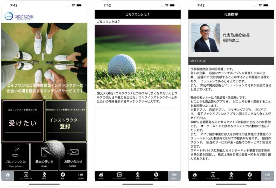 内容/機能:GOLF ONE(ゴルフワン)はゴルフがうまくなりたい人とゴルフの楽しさや魅力を伝えたいゴルフインストラクターとの出会いの場を提供するマッチングアプリサービスです。
