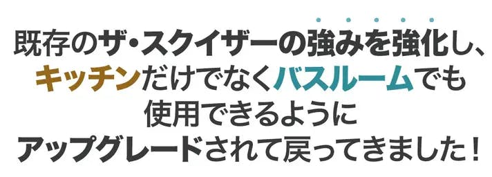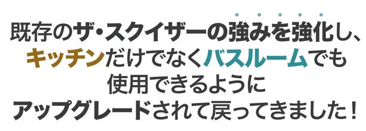 ザ・スクイーザー2は、キッチンだけでなく浴室でもお使いいただけます。湿気の多い環境でも安心して使えるよう、腐食しないプラスチック素材を採用し、金属製品に匹敵する強度を実現しました。