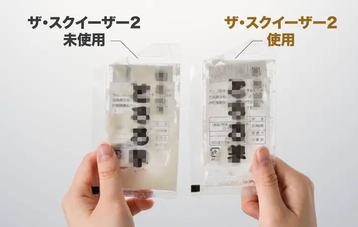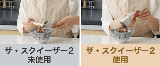 ザ・スクイーザー2なら、袋を挟んで押すだけ。手を汚さず、最後まできれいに絞り出せます。