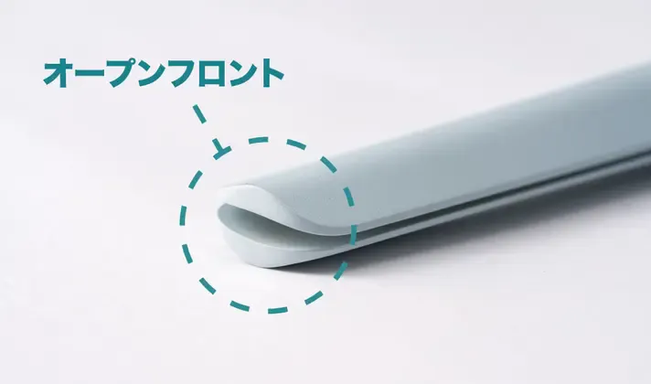 唯一の解決策は、先端を塞がずに開いた“オープンフロント”を導入することでした。オープンフロントでも曲がらず硬さを維持できるようにデザイン・設計し、10回以上の製造テストと金型修正を経て、ついに完成。