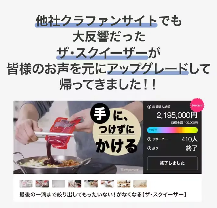 2026/01/25 09:00The Squeezer2を最大割引価格でご購入いただけるチャンスは、本日まもなく終了となります。実際にお使いいただいた際にご満足いただけるよう、品質にこだわった製品づくりに努めてまいりました。皆さまのご期待にお応えできるよう、最後まで責任を持って対応してまいります。これまでのご支援に、心より感謝申し上げます。どうぞよろしくお願いいたします。 もっと見る