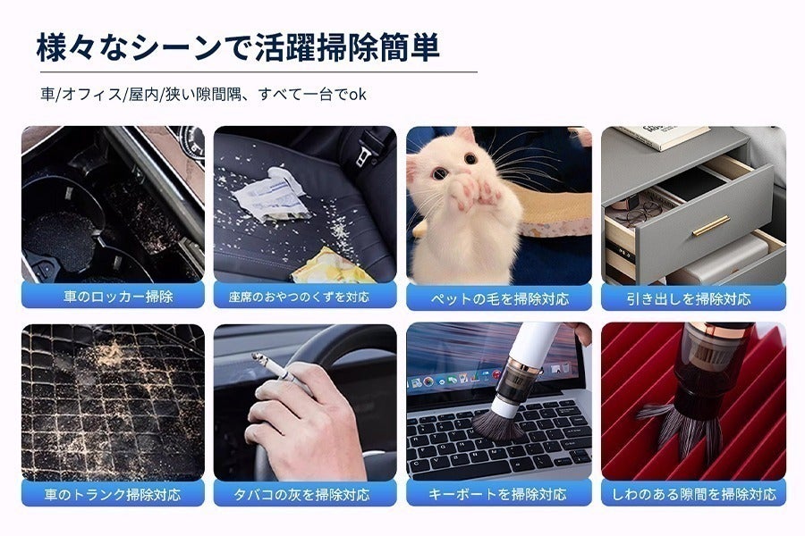 ミニハンディ掃除機使いだら、これらの悩みを解決してくれるかもしれませんよ。この超ミニハンディ掃除機は、重さが178 gしかないので、小さな隙間や脆弱な電子画面を掃除するのに役立ちます。清潔なデスクと車内掃除おすすめです。