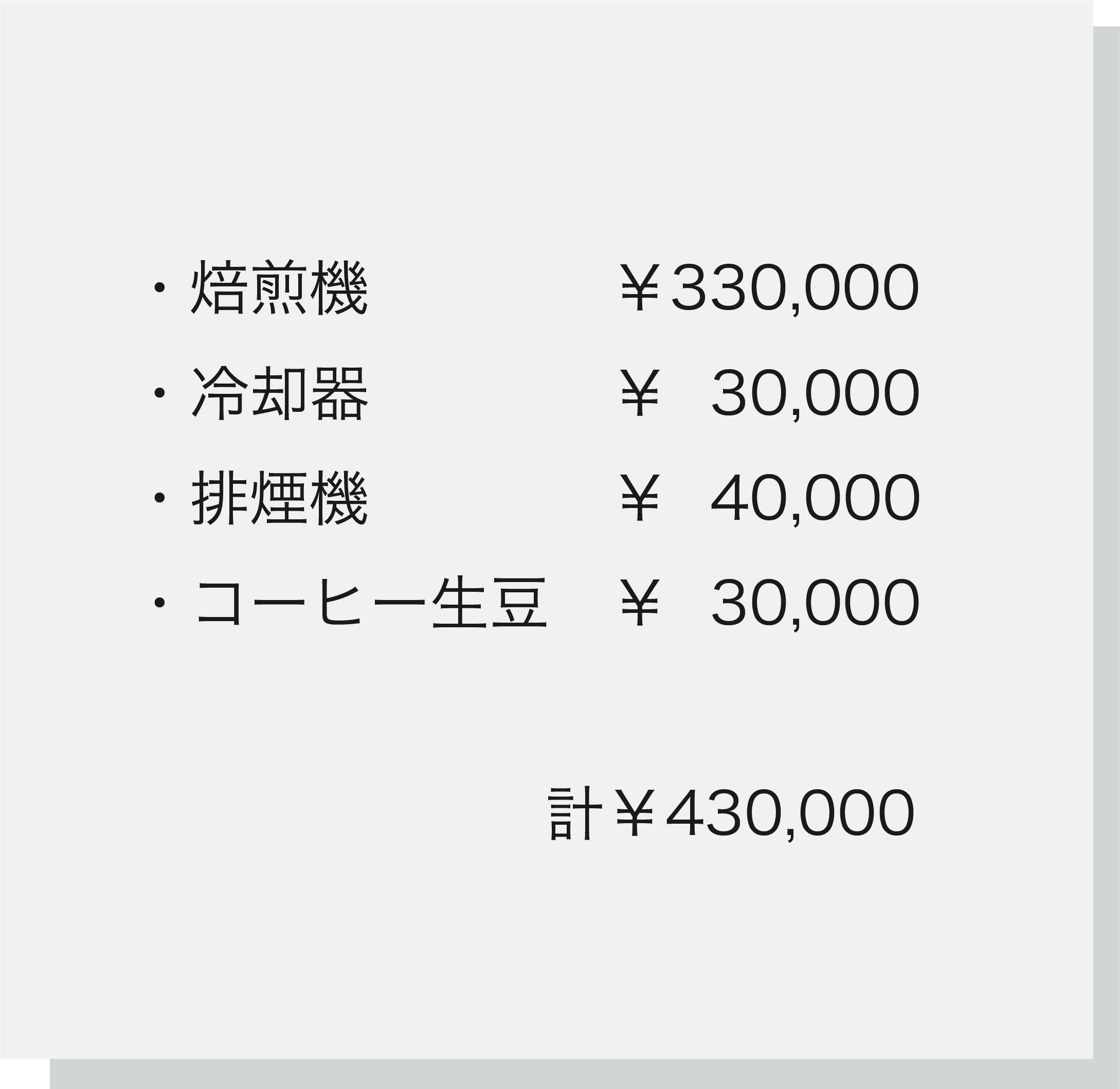 • ・焙煎機    ¥330,000 ・冷却器    ¥ 30,000 ・排煙機    ¥ 40,000 ・コーヒー生豆 ¥ 30,000