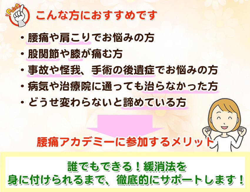 私たちは、多くの方に緩消法を広めたい、痛みを取り除いてほしいという思いから「腰痛アカデミー」を主催しています。過去17年間で1,600回以上開催してきた学習会をはじめ、症状別の指導などのサポートを提供しています。