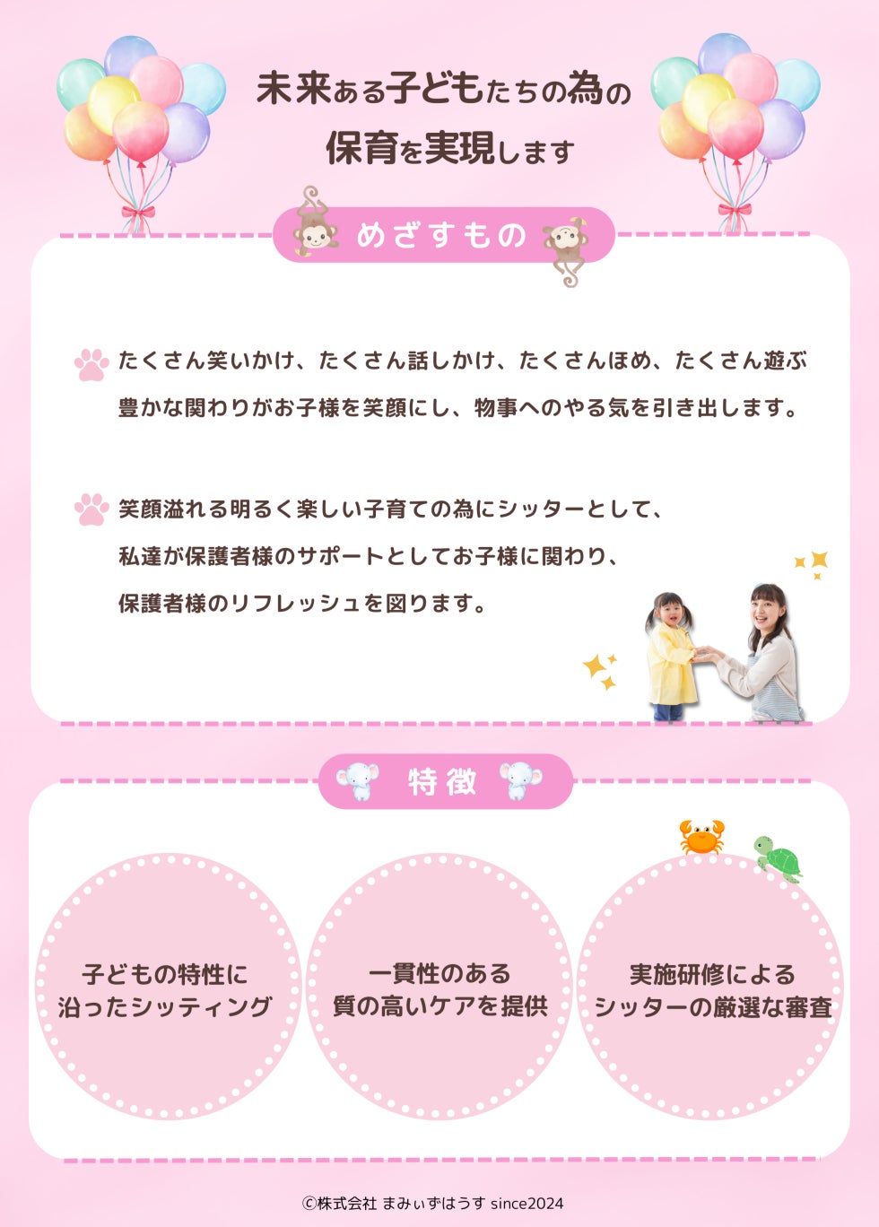 株式会社まみぃずはうすは、子育て支援と地域社会の活性化に情熱を注いでいる会社です。私たちは、子育てをする親御さんが安心して外出やリフレッシュできる環境を提供するために活動しています。これまでに、多くの親御さんからの支持と協力を得て、地域での子育て支援をしてきました。