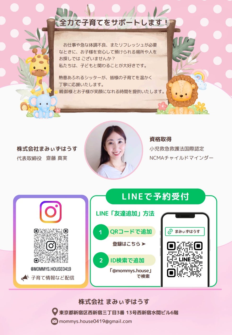 私はベビーシッター会社を経営しています。(株式会社まみぃずはうす 所在地東京都新宿区西新宿3丁目3番13号 水間ビル6階)