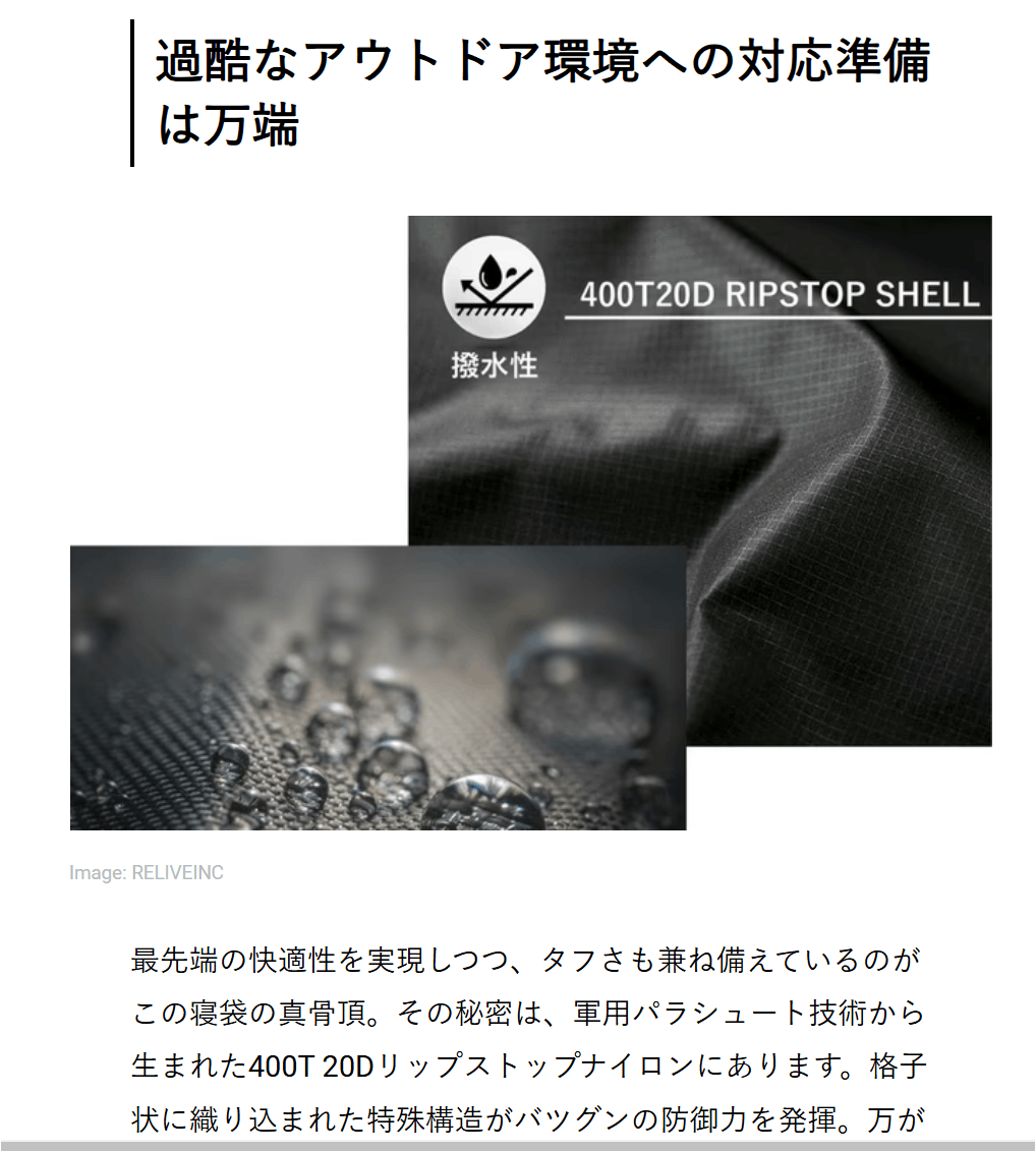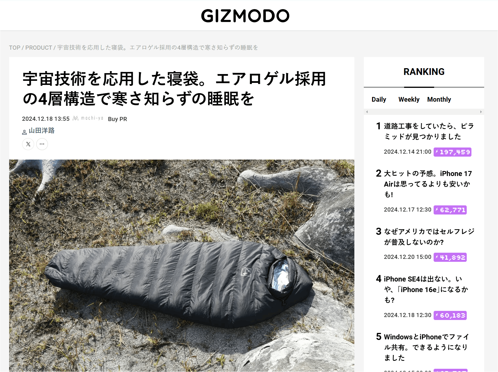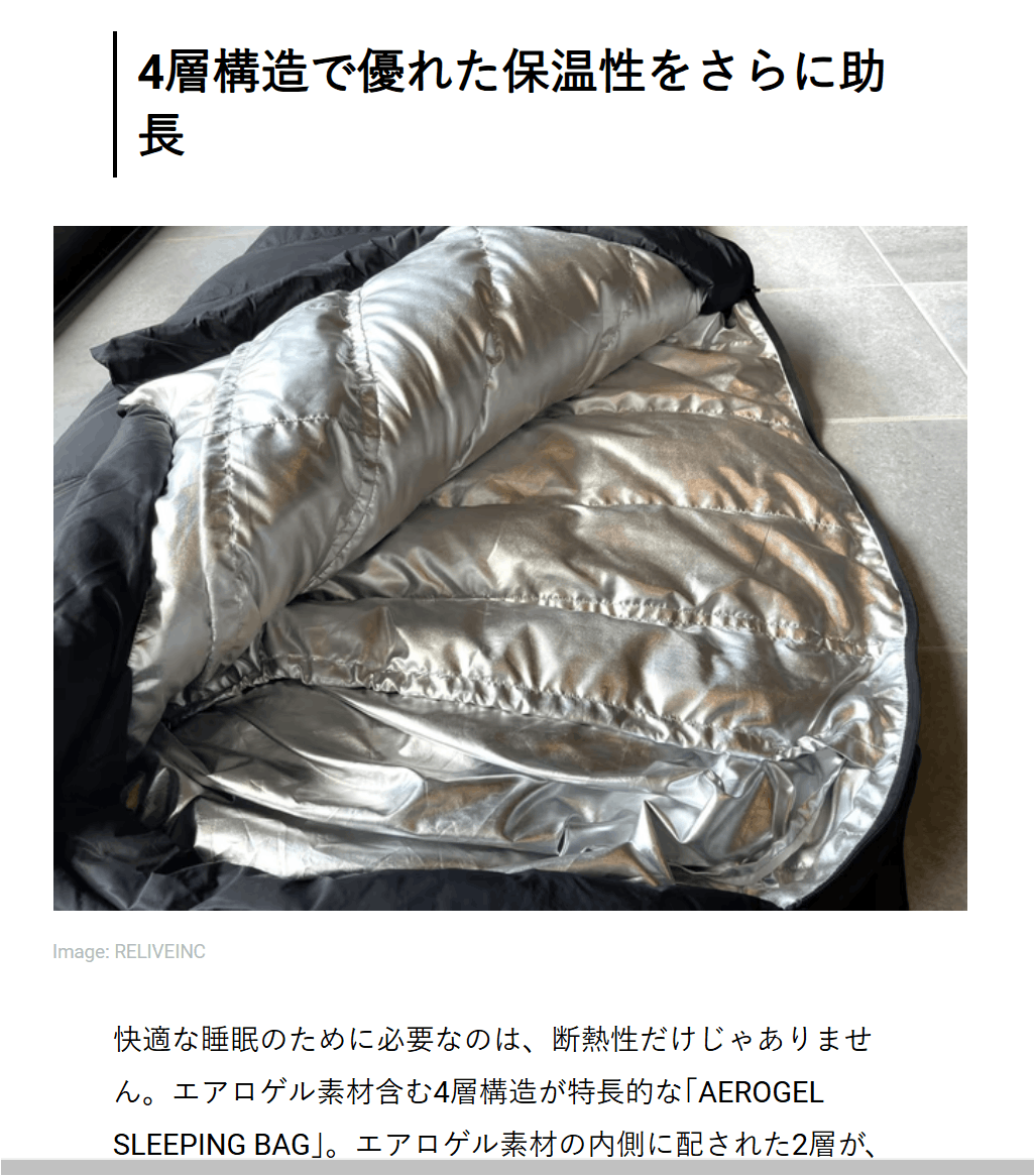 「宇宙技術を応用した寝袋。エアロゲル採用の4層構造で寒さ知らずの睡眠を」