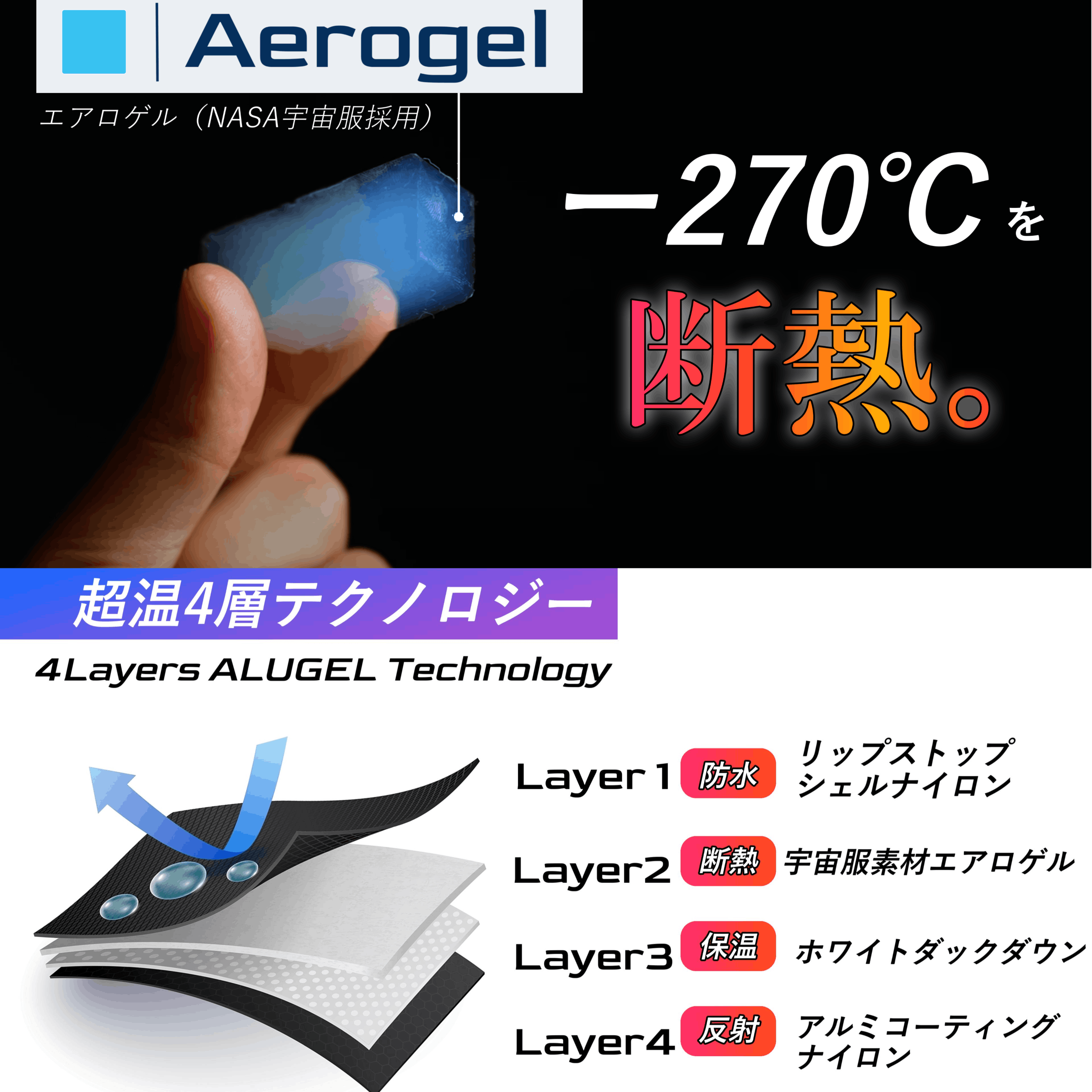 4層構造の強みは、エアロゲルが断熱性を発揮し、更に裏地のアルミニウムナイロンの反射熱の効果で【体を入れたらすぐに暖かくなる】というシステムになっているのです。