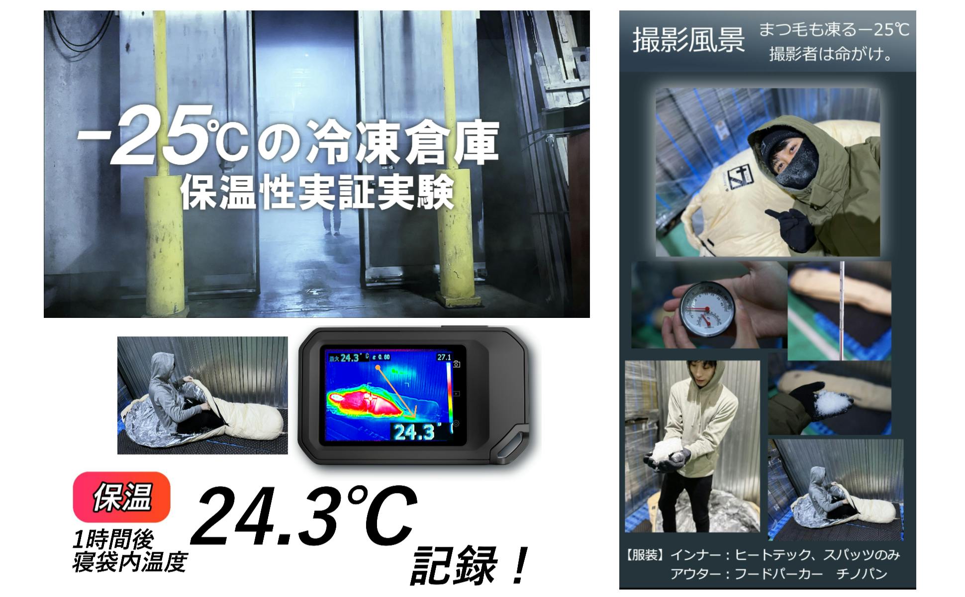 4inch.プロジェクトチームです!多くのご支援いただき誠にありがとうございます!《【次世代マミー型寝袋】4層構造宇宙服素材エアロゲルテクノロジー》は-25℃の冷凍倉庫の環境にて、1時間の耐寒実験を実施し、1時間経過後のサーモカメラによる寝袋内温度は驚異の”24.3℃”を記録しました!【暖かさの秘密】4層構造宇宙服素材エアロゲルテクノロジー【▼プロジェクトはこちら】【次世代マミー型寝袋】4層構造宇宙服素材エアロゲルテクノロジー》